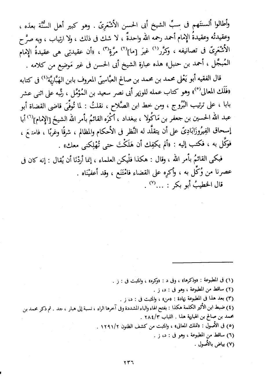 قَالَ الْفَقِيه أَبُو يعلى مُحَمَّد بن مُحَمَّد بن صَالح العباسي الْمَعْرُوف بِابْن الهبارية فِي كِتَابه فلك الْمَعَالِي وَهُوَ كتاب عمله للوزير أبي نصر سعيد بن المؤمل رُتْبَة على اثنى عشر بَابا على تَرْتِيب البروج وَمن خطّ ابْن الصّلاح نقلت لما توفّي قَاضِي الْقُضَاة أَبُو عبد الله الْحُسَيْن بن جَعْفَر بن مَاكُولَا بِبَغْدَاد أكره الْقَائِم بِأَمْر الله الشَّيْخ الإِمَام أَبَا إِسْحَاق الفيروزابادي على أَن يتقلد لَهُ النّظر فِي الإحكام والمظالم شرقا وغربا فَامْتنعَ فَوكل بِهِ فَكتب إِلَيْهِ ألم يكفك أَن هَلَكت حَتَّى تهلكني مَعَك