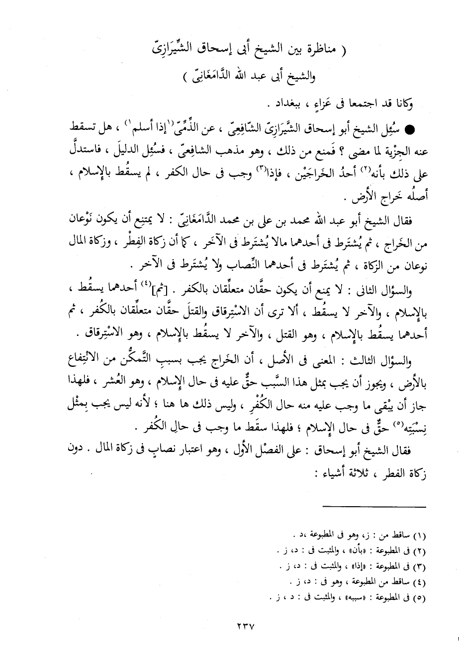 سُئِلَ الشَّيْخ أَبُو إِسْحَاق الشِّيرَازِيّ الشَّافِعِي عَن الذِّمِّيّ إِذا أسلم هَل تسْقط عَنهُ الْجِزْيَة لما مضى فَمنع من ذَلِك وَهُوَ مَذْهَب الشَّافِعِي فَسئلَ الدَّلِيل فاستدل على ذَلِك بِأَنَّهُ أحد الخراجين فَإِذا وَجب فِي حَال الْكفْر لم يسْقط بِالْإِسْلَامِ أَصله خراج الأَرْض