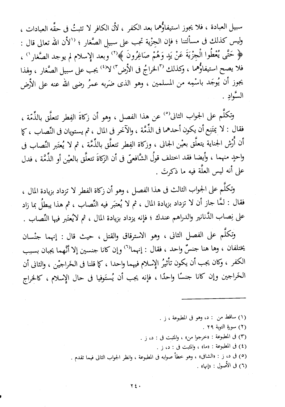 وَتكلم على الْفَصْل الثَّانِي وَهُوَ الاسترقاق وَالْقَتْل حَيْثُ قَالَ إنَّهُمَا جِنْسَانِ يَخْتَلِفَانِ وَهَاهُنَا جنس وَاحِد فَقَالَ إنَّهُمَا وَإِن كَانَا جِنْسَيْنِ إِلَّا أَنَّهُمَا يجبان بِسَبَب الْكفْر وَكَانَ يجب أَن يكون تَأْثِير الْإِسْلَام فيهمَا وَاحِدًا كَمَا قُلْنَا فِي الخراجين وَالثَّانِي أَن الخراجين وَإِن كَانَا جِنْسا وَاحِدًا فَإِنَّهُ يجب أَن يستوفيا فِي حَال الْإِسْلَام كالخراج
