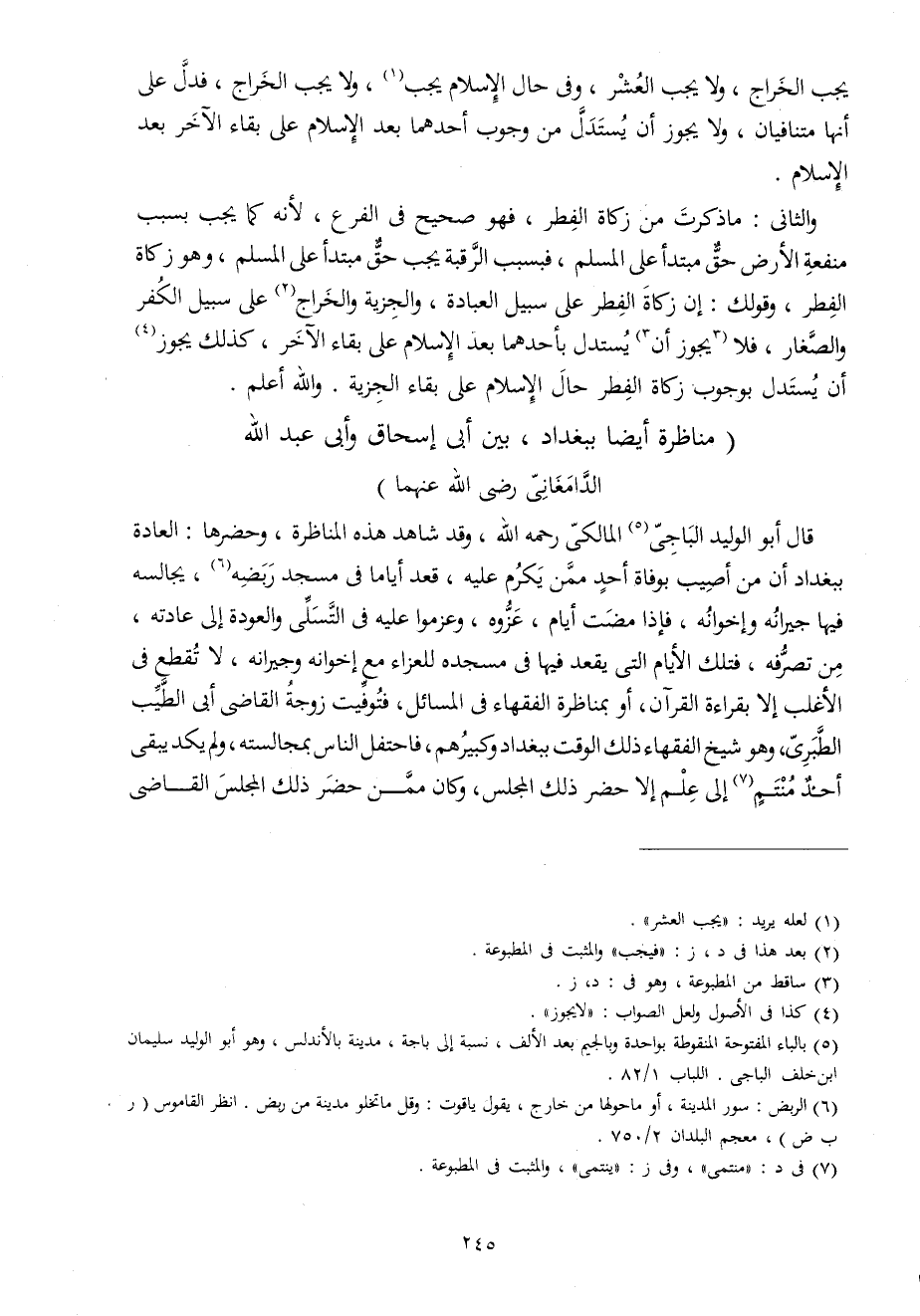 قَالَ أَبُو الْوَلِيد الْبَاجِيّ الْمَالِكِي رَحمَه الله وَقد شَاهد هَذِه المناظرة وحضرها الْعَادة بِبَغْدَاد أَن من أُصِيب بوفاة أحد مِمَّن يكرم عَلَيْهِ قعد أَيَّامًا فِي مَسْجِد ربضه يجالسه فِيهَا جِيرَانه وإخوانه فَإِذا مَضَت أَيَّام عزوه وعزموا عَلَيْهِ فِي التسلي والعودة إِلَى عَادَته من تصرفه فَتلك الْأَيَّام الَّتِي يقْعد فِيهَا فِي مَسْجده للعزاء مَعَ إخوانه وجيرانه لَا تقطع فِي الْأَغْلَب إِلَّا بِقِرَاءَة الْقُرْآن أَو بمناظرة الْفُقَهَاء فِي الْمسَائِل فَتُوُفِّيَتْ زَوْجَة القَاضِي أبي الطّيب الطَّبَرِيّ وَهُوَ شيخ الْفُقَهَاء ذَلِك الْوَقْت بِبَغْدَاد وَكَبِيرهمْ فاحتفل النَّاس بمجالسته وَلم يكد يبْقى أحد منتم إِلَى علم إِلَّا حضر ذَلِك الْمجْلس وَكَانَ مِمَّن حضر ذَلِك الْمجْلس القَاضِي