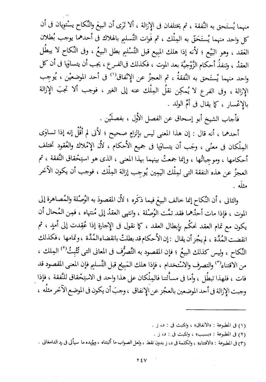 مِنْهُمَا يسْتَحق بِهِ النَّفَقَة ثمَّ يَخْتَلِفَانِ فِي الْإِزَالَة أَلا ترى أَن البيع وَالنِّكَاح يستويان فِي أَن كل وَاحِد مِنْهُمَا يسْتَحق بِهِ الْملك ثمَّ فَوَات التَّسْلِيم بِالْهَلَاكِ فِي أَحدهمَا يُوجب بطلَان العقد وَهُوَ البيع لِأَنَّهُ إِذا هلك الْمَبِيع قبل التَّسْلِيم بَطل البيع وَفِي النِّكَاح لَا يبطل العقد وتنفذ أَحْكَام الزَّوْجِيَّة بعد الْمَوْت فَكَذَلِك فِي الْفَرْع يجب أَن يتساويا فِي أَن كل وَاحِد مِنْهُمَا يسْتَحق بِهِ النَّفَقَة ثمَّ الْعَجز عَن الْإِنْفَاق فِي أحد الْمَوْضِعَيْنِ يُوجب الْإِزَالَة وَفِي الْفَرْع لَا يُمكن نقل الْملك عَنهُ إِلَى الْغَيْر فَوَجَبَ أَلا تجب الْإِزَالَة بالإعسار كَمَا يُقَال فِي أم الْوَلَد
