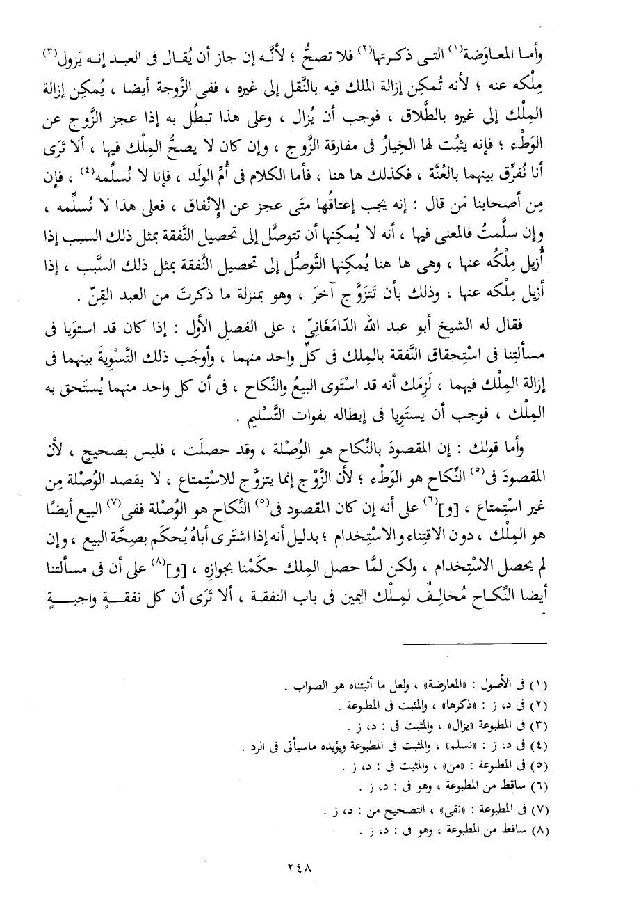 فَقَالَ لَهُ الشَّيْخ أَبُو عبد الله الدَّامغَانِي على الْفَصْل الأول إِذا كَانَ قد اسْتَويَا فِي مَسْأَلَتنَا فِي اسْتِحْقَاق النَّفَقَة بِالْملكِ فِي كل وَاحِد مِنْهُمَا وَأوجب ذَلِك التَّسْوِيَة بَينهمَا فِي إِزَالَة الْملك فيهمَا لزمك أَنه قد اسْتَوَى البيع وَالنِّكَاح فِي أَن كل وَاحِد مِنْهُمَا يسْتَحق بِهِ الْملك فَوَجَبَ أَن يستويا فِي إِبْطَاله بِفَوَات التَّسْلِيم