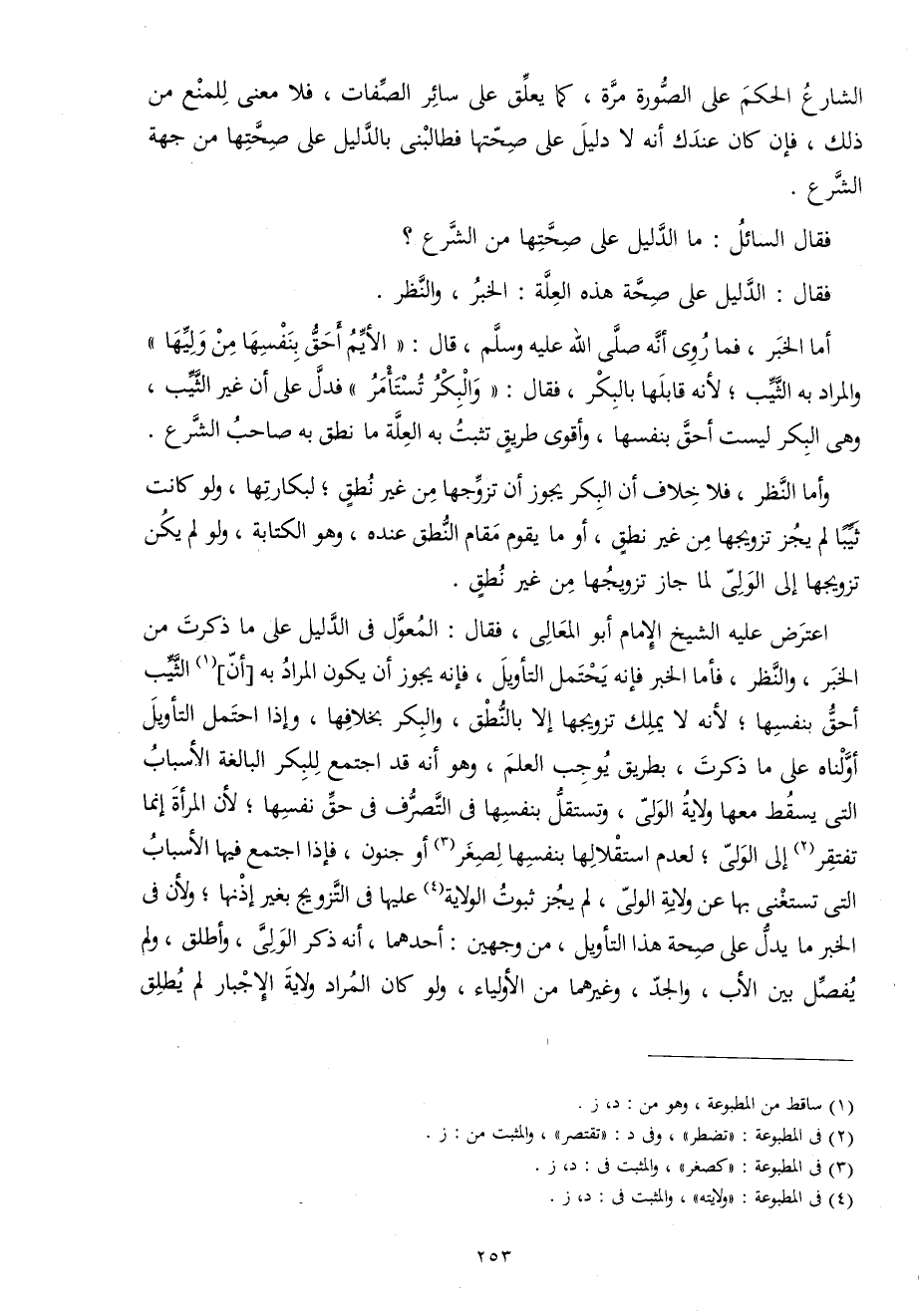اعْترض عَلَيْهِ الشَّيْخ الإِمَام أَبُو الْمَعَالِي فَقَالَ الْمعول فِي الدَّلِيل على مَا ذكرت من الْخَبَر وَالنَّظَر فَأَما الْخَبَر فَإِنَّهُ يحْتَمل التَّأْوِيل فَإِنَّهُ يجوز أَن يكون المُرَاد بِهِ أَن الثّيّب أَحَق بِنَفسِهَا لِأَنَّهُ لَا يملك تَزْوِيجهَا إِلَّا بالنطق وَالْبكْر بِخِلَافِهَا وَإِذا احْتمل التَّأْوِيل أولناه على مَا ذكرت بطرِيق يُوجب الْعلم وَهُوَ أَنه قد اجْتمع للبكر الْبَالِغَة الْأَسْبَاب الَّتِي يسْقط مَعهَا ولَايَة الْوَلِيّ وتستقل بِنَفسِهَا فِي التَّصَرُّف فِي حق نَفسهَا لِأَن الْمَرْأَة إِنَّمَا تفْتَقر إِلَى الْوَلِيّ لعدم استقلالها بِنَفسِهَا لصِغَر أَو جُنُون فَإِذا اجْتمع فِيهَا الْأَسْبَاب الَّتِي تَسْتَغْنِي بهَا عَن ولَايَة الْوَلِيّ لم يجز ثُبُوت الْولَايَة عَلَيْهَا فِي التَّزْوِيج بِغَيْر إِذْنهَا وَلِأَن فِي الْخَبَر مَا يدل على صِحَة هَذَا التَّأْوِيل من وَجْهَيْن أَحدهمَا أَنه ذكر الْوَلِيّ وَأطلق وَلم يفصل بَين الْأَب وَالْجد وَغَيرهمَا من الْأَوْلِيَاء وَلَو كَانَ المُرَاد ولَايَة الْإِجْبَار لم يُطلق