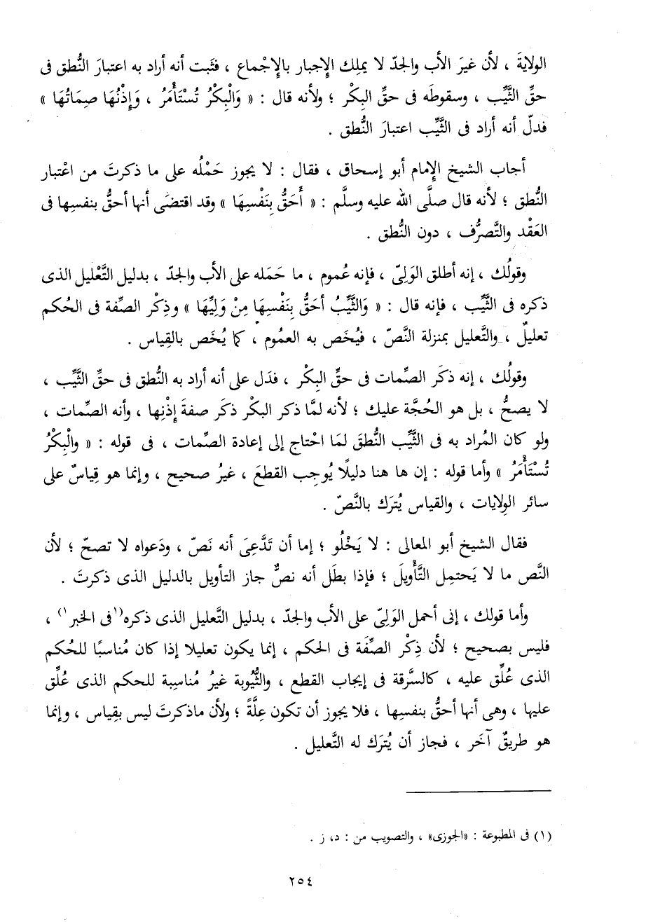وَأما قَوْلك إِنِّي أحمل الْوَلِيّ على الْأَب وَالْجد بِدَلِيل التَّعْلِيل الَّذِي ذكره فِي الْخَبَر فَلَيْسَ بِصَحِيح لِأَن ذكر الصّفة فِي الحكم إِنَّمَا يكون تعليلا إِذا كَانَ مناسبا للْحكم الَّذِي علق عَلَيْهِ كالسرقة فِي إِيجَاب الْقطع والثيوبة غير مُنَاسبَة للْحكم الَّذِي علق عَلَيْهَا وَهِي أَنَّهَا أَحَق بِنَفسِهَا فَلَا يجوز أَن تكون عِلّة وَلِأَن مَا ذكرت لَيْسَ بِقِيَاس وَإِنَّمَا هُوَ طَرِيق آخر فَجَاز أَن يتْرك لَهُ التَّعْلِيل