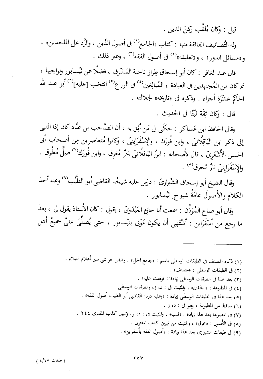 وَقَالَ الشَّيْخ أَبُو إِسْحَاق الشِّيرَازِيّ درس عَلَيْهِ شَيخنَا القَاضِي أَبُو الطّيب وَعنهُ أَخذ الْكَلَام وَالْأُصُول عَامَّة شُيُوخ نيسابور