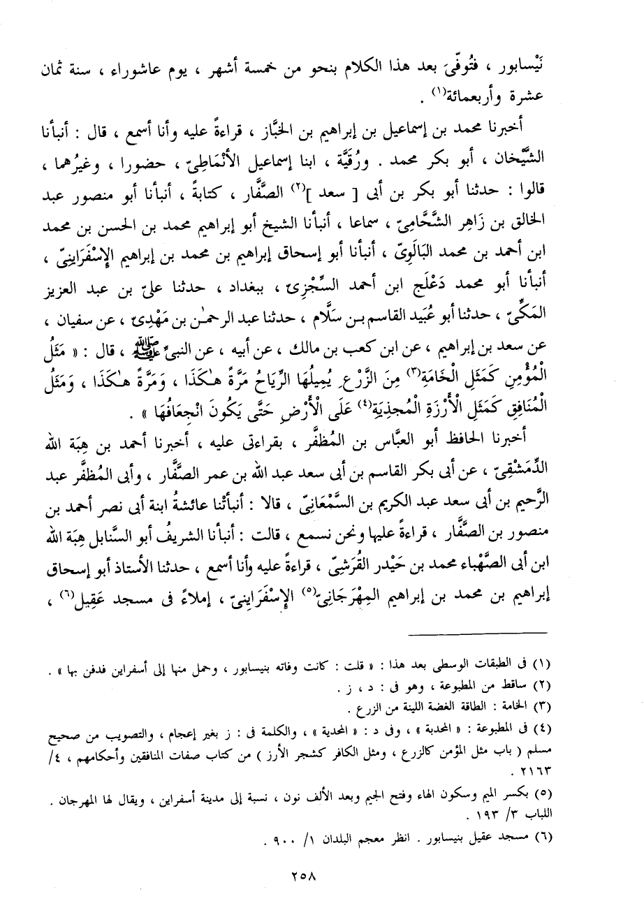 أخبرنَا مُحَمَّد بن إِسْمَاعِيل بن إِبْرَاهِيم بن الخباز قِرَاءَة عَلَيْهِ وَأَنا أسمع قَالَ أَنبأَنَا الشَّيْخَانِ أَبُو بكر مُحَمَّد ورقية ابْنا إِسْمَاعِيل الْأنمَاطِي حضورا وَغَيرهمَا قَالُوا حَدثنَا أَبُو بكر بن أبي سعد الصفار كِتَابَة أَنبأَنَا أَبُو مَنْصُور عبد الْخَالِق بن زَاهِر الشحامي سَمَاعا أَنبأَنَا الشَّيْخ أَبُو إِبْرَاهِيم مُحَمَّد بن الْحسن بن مُحَمَّد ابْن أَحْمد بن مُحَمَّد البالوي أَنبأَنَا أَبُو إِسْحَاق إِبْرَاهِيم بن مُحَمَّد بن إِبْرَاهِيم الإسفرايني أَنبأَنَا أَبُو مُحَمَّد دعْلج ابْن أَحْمد السجْزِي بِبَغْدَاد حَدثنَا عَليّ بن عبد الْعَزِيز الْمَكِّيّ حَدثنَا أَبُو عبيد الْقَاسِم بن سَلام حَدثنَا عبد الرَّحْمَن بن مهْدي عَن سُفْيَان عَن سعد بن إِبْرَاهِيم عَن ابْن كَعْب بن مَالك عَن أَبِيه عَن النَّبِي صلى الله عَلَيْهِ وَسلم قَالَ (مثل الْمُؤمن كَمثل الخامة من الزَّرْع يميلها الرِّيَاح مرّة هَكَذَا وَمرَّة هَكَذَا وَمثل الْمُنَافِق كَمثل الأرزة المجذية على الأَرْض حَتَّى يكون انجعافها)