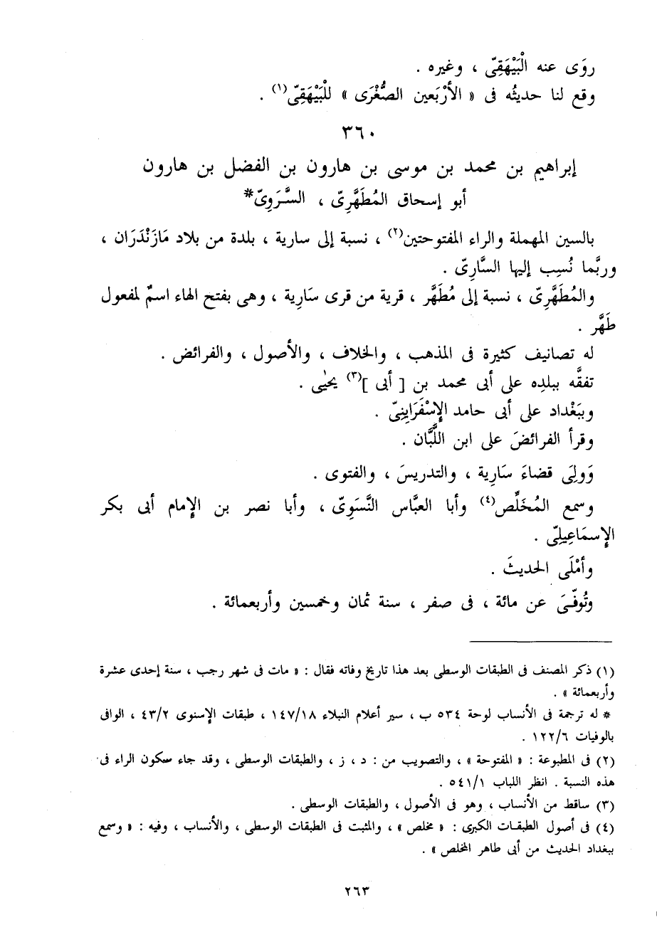 360 - إِبْرَاهِيم بن مُحَمَّد بن مُوسَى بن هَارُون بن الْفضل بن هَارُون أَبُو إِسْحَاق المطهري السروي