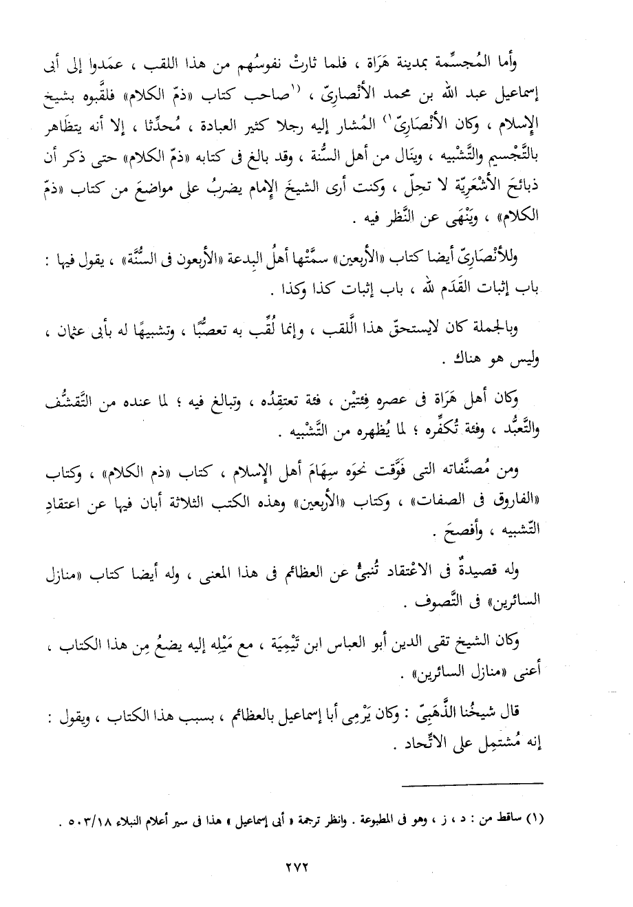 وَأما المجسمة بِمَدِينَة هراة فَلَمَّا ثارت نُفُوسهم من هَذَا اللقب عَمدُوا إِلَى أبي إِسْمَاعِيل عبد الله بن مُحَمَّد الْأنْصَارِيّ صَاحب كتاب ذمّ الْكَلَام فلقبوه بشيخ الْإِسْلَام وَكَانَ الْأنْصَارِيّ الْمشَار إِلَيْهِ رجلا كثير الْعِبَادَة مُحدثا إِلَّا أَنه يتظاهر بالتجسيم والتشبيه وينال من أهل السّنة وَقد بَالغ فِي كِتَابه ذمّ الْكَلَام حَتَّى ذكر أَن ذَبَائِح الأشعرية لَا تحل وَكنت أرى الشَّيْخ الإِمَام يضْرب على مَوَاضِع من كتاب ذمّ الْكَلَام وَينْهى عَن النّظر فِيهِ