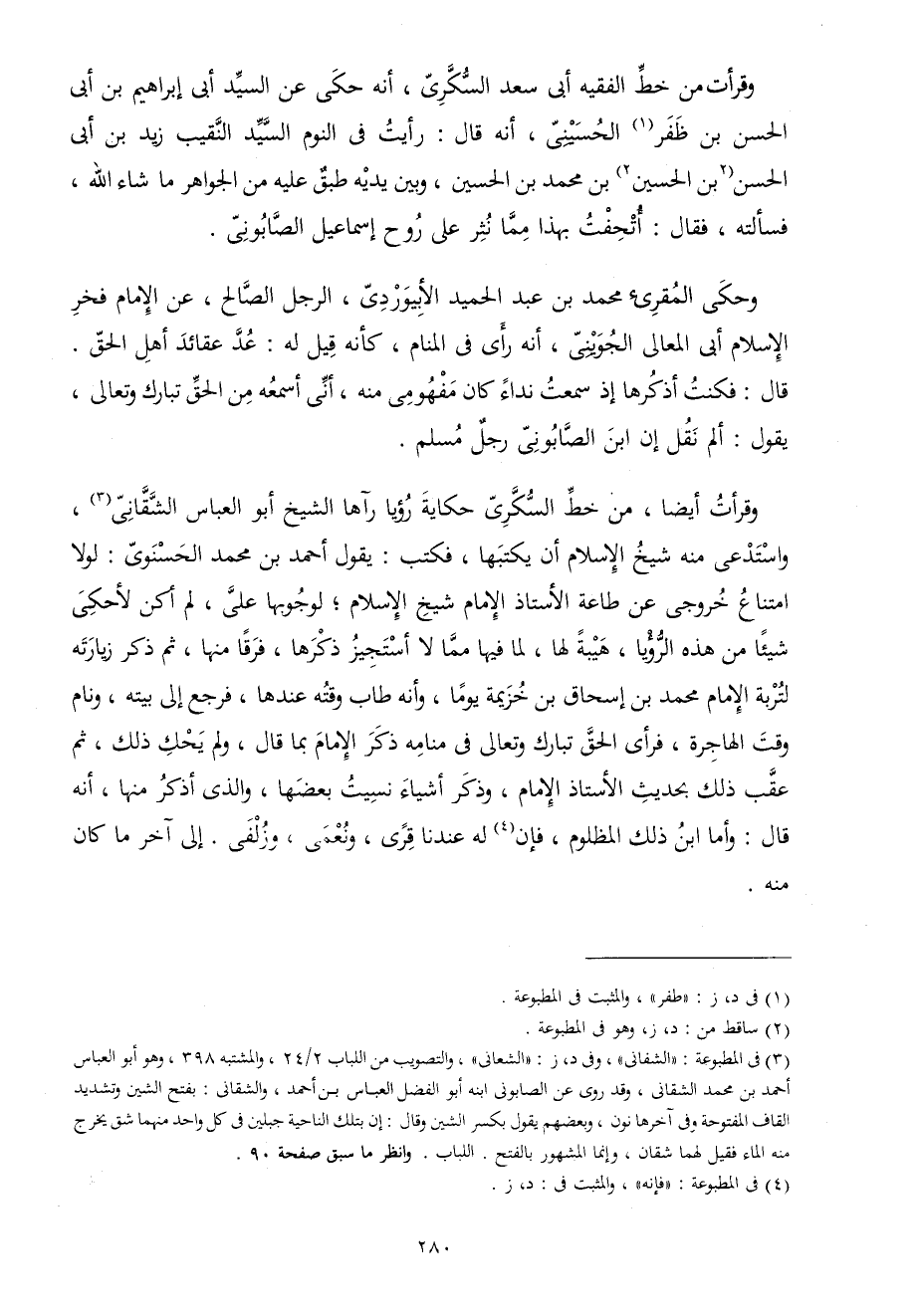وقرأت أَيْضا من خطّ السكرِي حِكَايَة رُؤْيا رَآهَا الشَّيْخ أَبُو الْعَبَّاس الشقاني واستدعى مِنْهُ شيخ الْإِسْلَام أَن يَكْتُبهَا فَكتب يَقُول أَحْمد بن مُحَمَّد الحسنوي لَوْلَا امْتنَاع خروجي عَن طَاعَة الْأُسْتَاذ الإِمَام شيخ الْإِسْلَام لوُجُوبهَا عَليّ لم أكن لأحكي شَيْئا من هَذِه الرُّؤْيَا هَيْبَة لَهَا لما فِيهَا مِمَّا لَا أستجيز ذكرهَا فرقا مِنْهَا ثمَّ ذكر زيارته لتربة الإِمَام مُحَمَّد بن إِسْحَاق بن خُزَيْمَة يَوْمًا وَأَنه طَابَ وقته عِنْدهَا فَرجع إِلَى بَيته ونام وَقت الهاجرة فَرَأى الْحق تبَارك وَتَعَالَى فِي مَنَامه ذكر الإِمَام بِمَا قَالَ وَلم يحك ذَلِك ثمَّ عقب ذَلِك بِحَدِيث الْأُسْتَاذ الإِمَام وَذكر أَشْيَاء نسيت بَعْضهَا وَالَّذِي أذكر مِنْهَا أَنه قَالَ وَأما ابْن ذَلِك الْمَظْلُوم فَإِن لَهُ عندنَا قرى ونعمى وزلفى