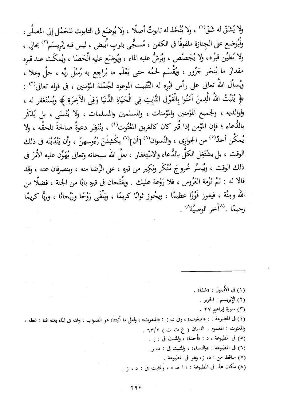 وَلَا يشق لَهُ شقّ وَلَا يتَّخذ لَهُ تَابُوت أصلا وَلَا يوضع فِي التابوت للْحَمْل إِلَى الْمصلى وليوضع على الْجِنَازَة ملفوفا فِي الْكَفَن مسجى بِثَوْب أَبيض لَيْسَ فِيهِ إبريسم بِحَال وَلَا يطين قَبره وَلَا يجصص ويرش عَلَيْهِ المَاء وَيُوضَع عَلَيْهِ الْحَصَا وَيمْكث عِنْد قَبره مِقْدَار مَا ينْحَر جزور وَيقسم لَحْمه حَتَّى يعلم مَا يُرَاجع بِهِ رسل ربه جلّ وَعلا وَيسْأل الله تَعَالَى على رَأس قَبره لَهُ التثبيت الْمَوْعُود لجملة الْمُؤمنِينَ فِي قَوْله تَعَالَى {يثبت الله الَّذين آمنُوا بالْقَوْل الثَّابِت فِي الْحَيَاة الدُّنْيَا وَفِي الْآخِرَة} ويستغفر لَهُ ولوالديه وَلِجَمِيعِ الْمُؤمنِينَ وَالْمُؤْمِنَات وَالْمُسْلِمين وَالْمُسلمَات وَلَا ينسى بل يذكر بِالدُّعَاءِ فَإِن الْمُؤمن إِذا قبر كَانَ كالغريق المغتوت ينْتَظر دَعْوَة صَالِحَة تلْحقهُ وَلَا يُمكن أحد من الْجَوَارِي والنسوان أَن يكشفن رءوسهن وَأَن يندبنه فِي ذَلِك الْوَقْت بل يشْتَغل الْكل بِالدُّعَاءِ وَالِاسْتِغْفَار لَعَلَّ الله سُبْحَانَهُ وَتَعَالَى يهون عَلَيْهِ الْأَمر فِي ذَلِك الْوَقْت وييسر خُرُوج مُنكر وَنَكِير من قَبره على الرِّضَا مِنْهُ وينصرفان عَنهُ وَقد قَالَا لَهُ نم نومَة الْعَرُوس فَلَا روعة عَلَيْك