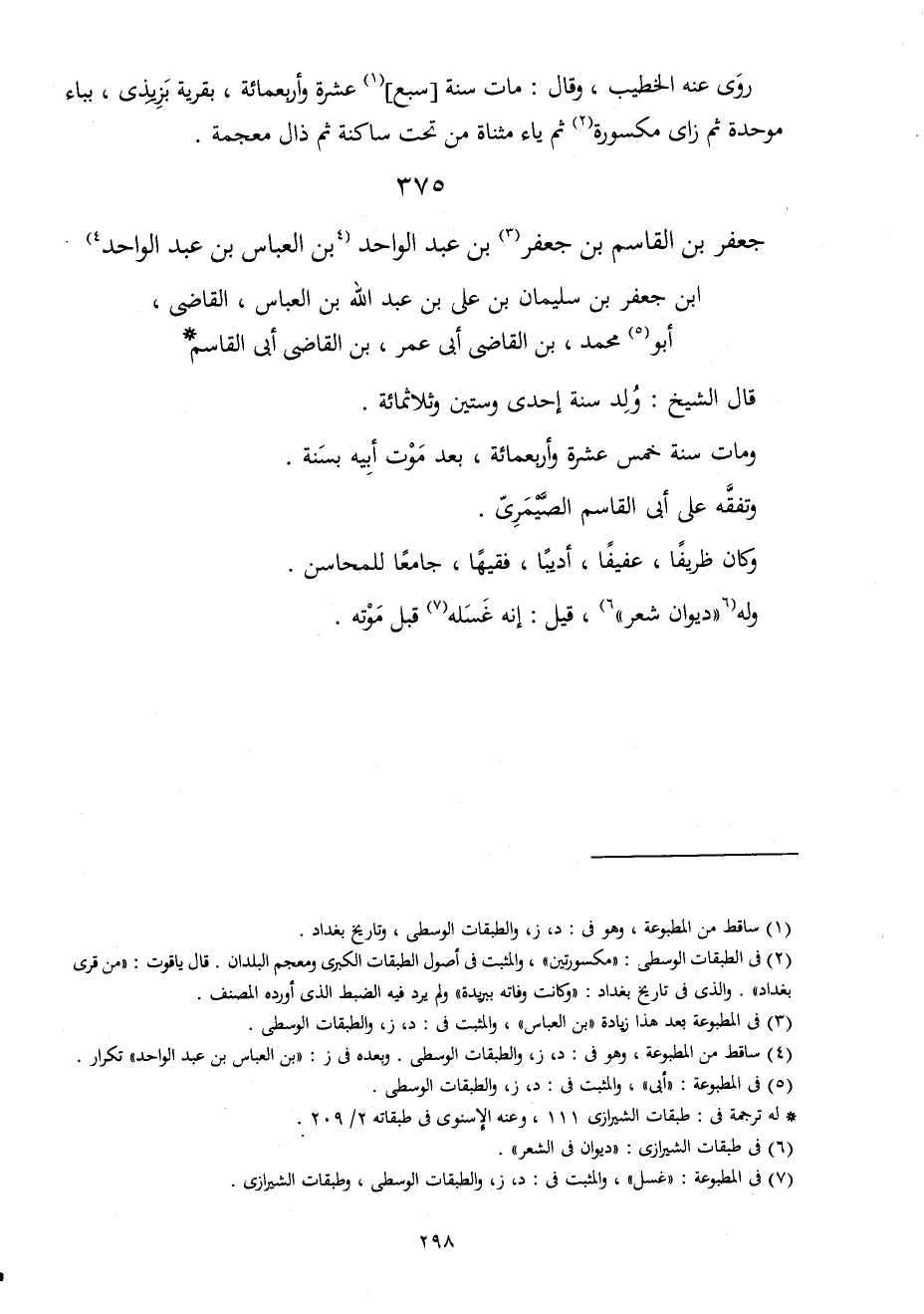 375 - جَعْفَر بن الْقَاسِم بن جَعْفَر بن عبد الْوَاحِد بن الْعَبَّاس بن عبد الْوَاحِد ابْن جَعْفَر بن سُلَيْمَان بن عَليّ بن عبد الله بن الْعَبَّاس القَاضِي أَبُو مُحَمَّد بن القَاضِي أبي عمر بن القَاضِي أبي الْقَاسِم