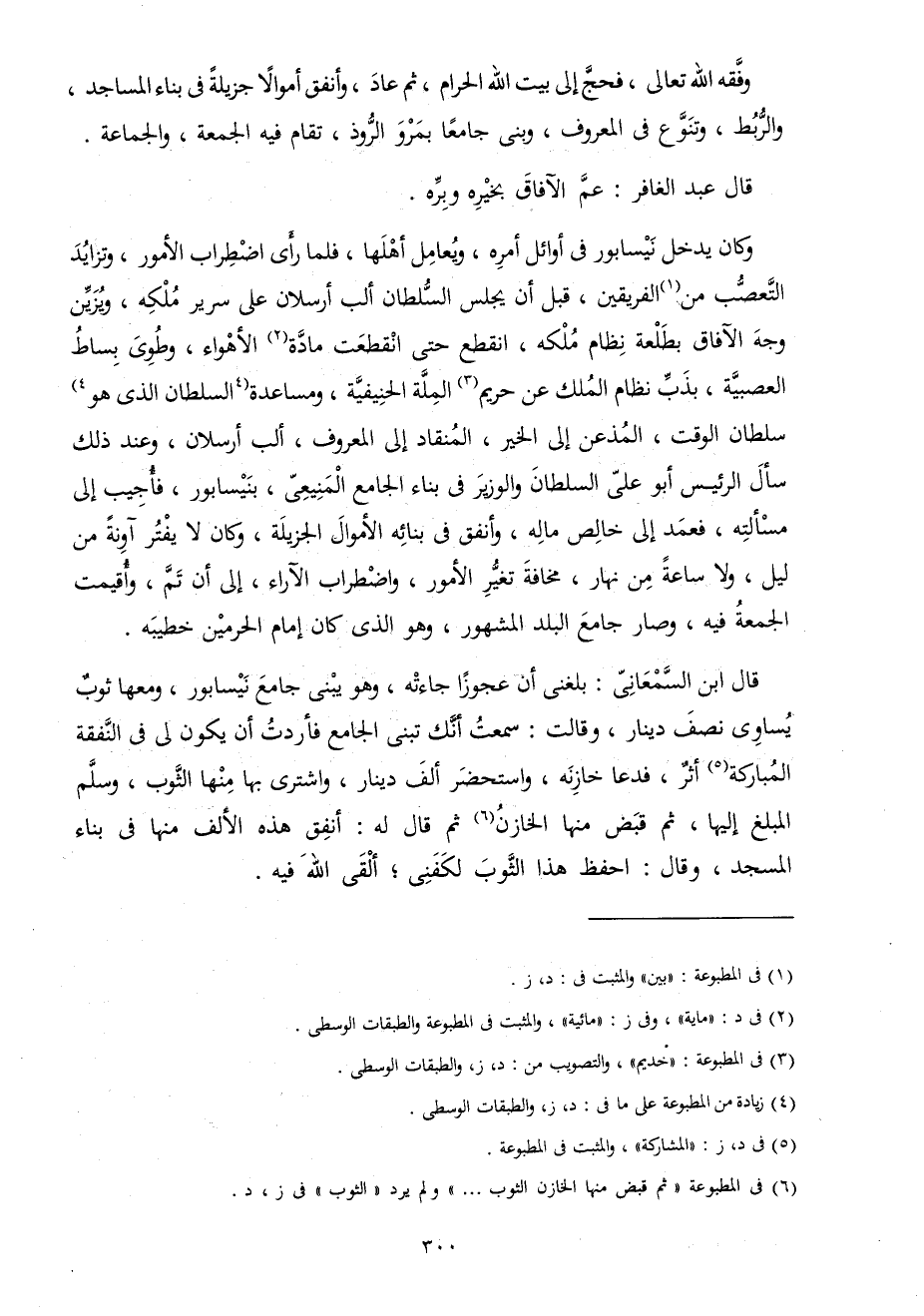 وَكَانَ يدْخل نيسابور فِي أَوَائِل أمره ويعامل أَهلهَا فَلَمَّا رأى اضْطِرَاب الْأُمُور وتزايد التعصب من الْفَرِيقَيْنِ قبل أَن يجلس السُّلْطَان ألب أرسلان على سَرِير ملكه ويزين وَجه الْآفَاق بطلعة نظام ملكه انْقَطع حَتَّى انْقَطَعت مَادَّة الْأَهْوَاء وطوي بِسَاط العصبية بذب نظام الْملك عَن حَرِيم الْملَّة الحنيفية ومساعدة السُّلْطَان الَّذِي هُوَ سُلْطَان الْوَقْت المذعن إِلَى الْخَيْر المنقاد إِلَى الْمَعْرُوف ألب أرسلان وَعند ذَلِك سَأَلَ الرئيس أَبُو عَليّ السُّلْطَان والوزير فِي بِنَاء الْجَامِع المنيعي بنيسابور فَأُجِيب إِلَى مَسْأَلته فَعمد إِلَى خَالص مَاله وَأنْفق فِي بنائِهِ الْأَمْوَال الجزيلة وَكَانَ لَا يفتر آونة من ليل وَلَا سَاعَة من نَهَار مَخَافَة تغير الْأُمُور واضطراب الآراء إِلَى أَن تمّ وأقيمت الْجُمُعَة فِيهِ وَصَارَ جَامع الْبَلَد الْمَشْهُور وَهُوَ الَّذِي كَانَ إِمَام الْحَرَمَيْنِ خَطِيبه