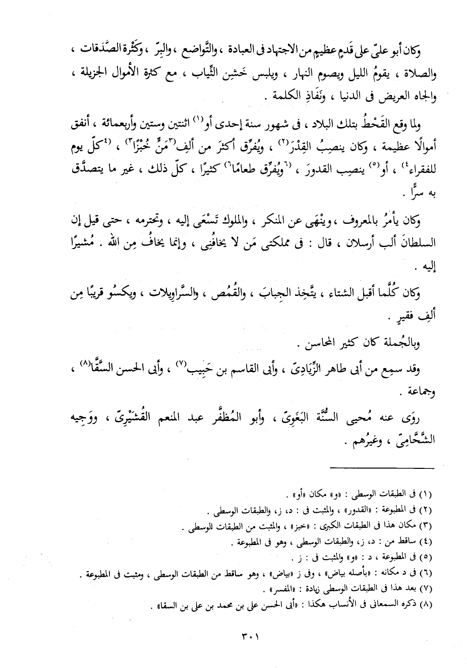 وَكَانَ أَبُو عَليّ على قدم عَظِيم من الِاجْتِهَاد فِي الْعِبَادَة والتواضع وَالْبر وَكَثْرَة الصَّدقَات وَالصَّلَاة يقوم اللَّيْل ويصوم النَّهَار ويلبس خشن الثِّيَاب مَعَ كَثْرَة الْأَمْوَال الجزيلة والجاه العريض فِي الدُّنْيَا ونفاذ الْكَلِمَة