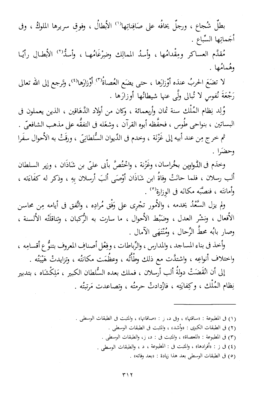 إِلَى أَن انْقَضتْ دولة ألب أرسلان فَملك بعده السُّلْطَان الْكَبِير ملكشاه بتدبير نظام الْملك وكفايته فازدادت حرمته وتصاعدت مرتبته
