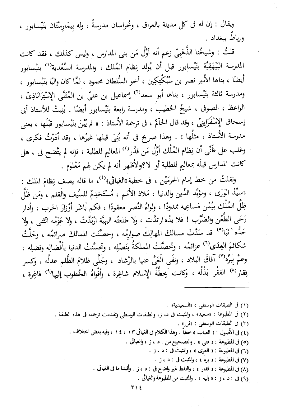 قلت وَشَيخنَا الذَّهَبِيّ زعم أَنه أول من بنى الْمدَارِس وَلَيْسَ كَذَلِك فقد كَانَت الْمدرسَة البيهقية بنيسابور قبل أَن يُولد نظام الْملك والمدرسة السعدية بنيسابور أَيْضا بناها الْأَمِير نصر بن سبكتكين أَخُو السُّلْطَان مَحْمُود لما كَانَ واليا بنيسابور ومدرسة ثَالِثَة بنيسابور بناها أَبُو سعد إِسْمَاعِيل بن عَليّ بن الْمثنى الإستراباذي الْوَاعِظ الصُّوفِي شيخ الْخَطِيب ومدرسة رَابِعَة بنيسابور أَيْضا