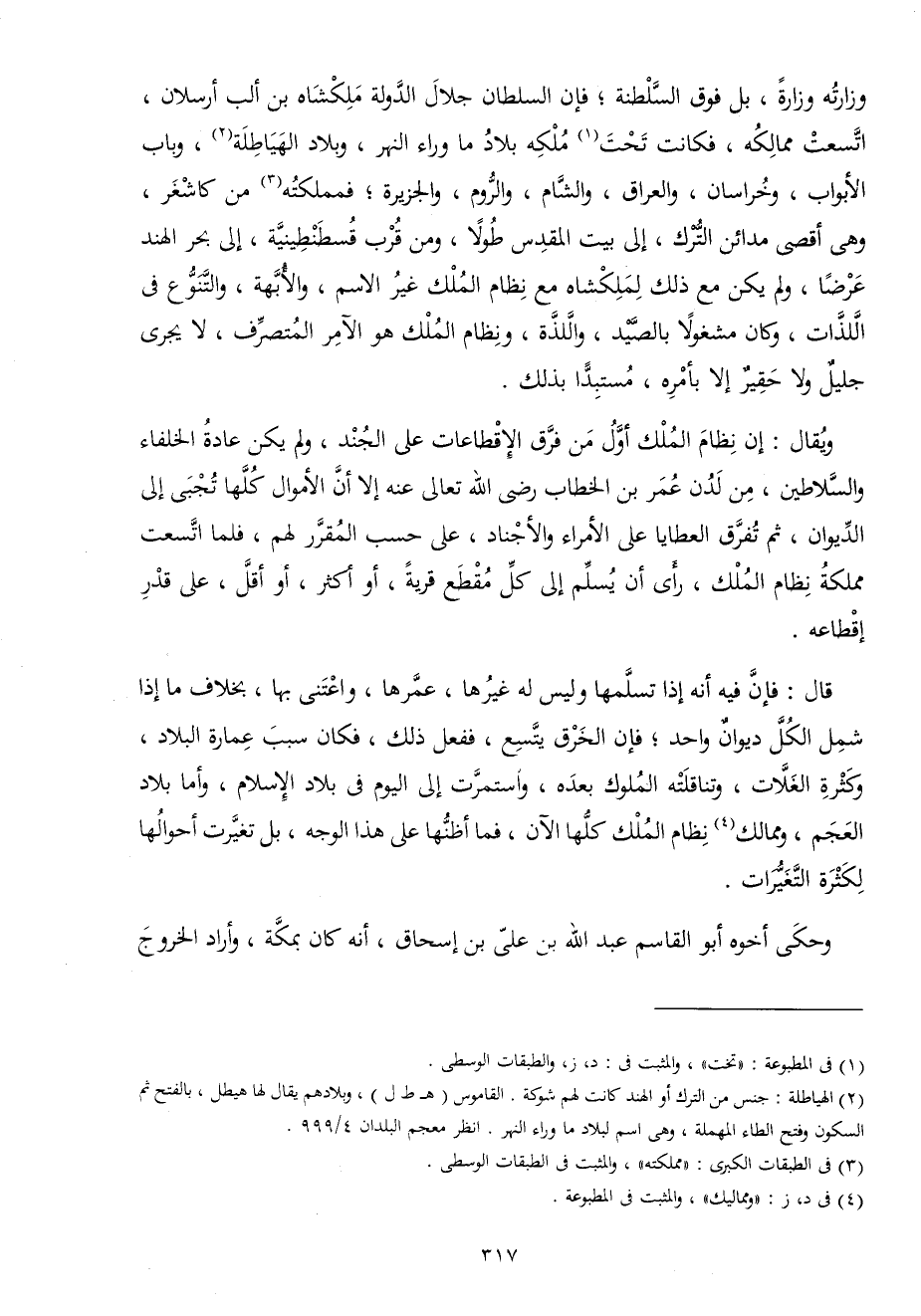 وَيُقَال إِن نظام الْملك أول من فرق الإقطاعات على الْجند وَلم يكن عَادَة الْخُلَفَاء والسلاطين من لدن عمر بن الْخطاب رَضِي الله تَعَالَى عَنهُ إِلَّا أَن الْأَمْوَال كلهَا تجبى إِلَى الدِّيوَان ثمَّ تفرق العطايا على الْأُمَرَاء والأجناد على حسب الْمُقَرّر لَهُم فَلَمَّا اتسعت مملكة نظام الْملك رأى أَن يسلم إِلَى كل مقطع قَرْيَة أَو أَكثر أَو أقل على قدر إقطاعه
