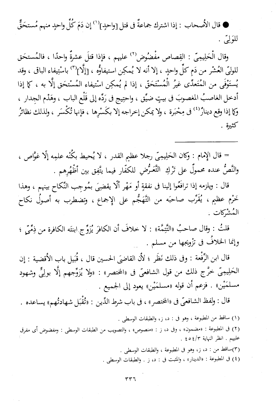 وَقَالَ الْحَلِيمِيّ الْقصاص مفضوض عَلَيْهِم فَإِذا قتل عشرَة وَاحِدًا فالمستحق للْوَلِيّ الْعشْر من دم كل وَاحِد إِلَّا أَنه لَا يُمكن اسْتِيفَاؤهُ إِلَّا بِاسْتِيفَاء الْبَاقِي وَقد يسْتَوْفى من الْمُتَعَدِّي غير الْمُسْتَحق إِذا لم يُمكن اسْتِيفَاء الْمُسْتَحق إِلَّا بِهِ كَمَا إِذا أَدخل الْغَاصِب الْمَغْصُوب فِي بَيت ضيق واحتيج فِي رده إِلَى قلع الْبَاب وَهدم الْجِدَار وكما إِذا وَقع دِينَار فِي محبرة وَلَا يُمكن إِخْرَاجه إِلَّا بِكَسْرِهَا فَإِنَّهَا تكسر وَلذَلِك نَظَائِر كَثِيرَة