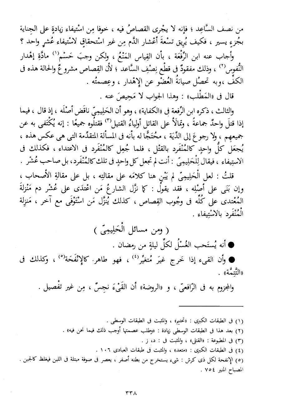 وَالثَّالِث ذكره ابْن الرّفْعَة فِي الْكِفَايَة وَهُوَ أَن الْحَلِيمِيّ نَاقض أَصله إِذْ قَالَ فِيمَا إِذا قتل وَاحِد جمَاعَة وتمالأ على الْقَاتِل أَوْلِيَاء الْقَتِيل فَقَتَلُوهُ جَمِيعًا إِنَّه يكْتَفى بِهِ عَن جَمِيعهم وَلَا رُجُوع إِلَى الدِّيَة محتجا لَهُ بِأَنَّهُ فِي الْمَسْأَلَة الْمُتَقَدّمَة الَّتِي هِيَ عكس هَذِه يَجْعَل كل وَاحِد كالمنفرد بِالْقَتْلِ فَلَمَّا جعل كالمنفرد فِي الاعتداء فَكَذَلِك فِي الِاسْتِيفَاء فَيُقَال للحليمي أَنْت لم تجْعَل كل وَاحِد فِي تِلْكَ كالمنفرد بل صَاحب عشر