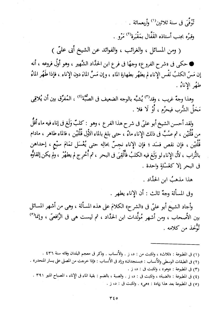 وأجاد الشَّيْخ أَبُو عَليّ فِي الشَّرْح الْكَلَام على هَذِه الْمَسْأَلَة وَهِي من أشهر الْمسَائِل بَين الْأَصْحَاب وَمن أشهر مولدات ابْن الْحداد ثمَّ لَيست هِيَ فِي الرَّافِعِيّ وَإِنَّمَا تُؤْخَذ من كَلَامه
