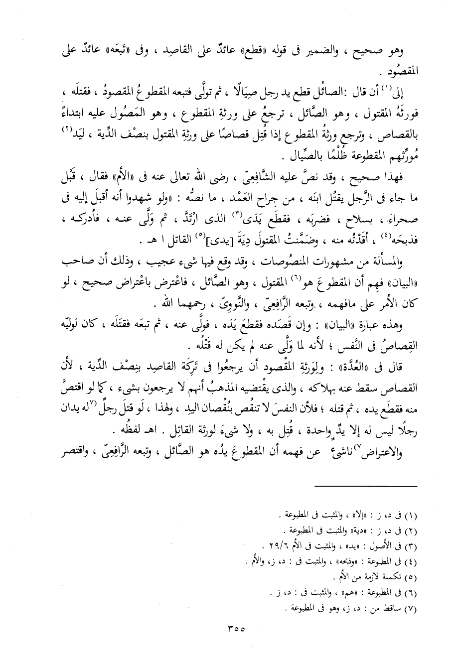 فَهَذَا صَحِيح وَقد نَص عَلَيْهِ الشَّافِعِي رَضِي الله تَعَالَى عَنهُ فِي الْأُم فَقَالَ قبل مَا جَاءَ فِي الرجل يقتل ابْنه من جراح الْعمد مَا نَصه وَلَو شهدُوا أَنه أقبل إِلَيْهِ فِي صحراء بسلاح فَضَربهُ فَقطع يَدي الَّذِي ارْتَدَّ ثمَّ ولى عَنهُ فأدركه فذبحه أقدته مِنْهُ وضمنت الْمَقْتُول دِيَة يَدي الْقَاتِل اهـ