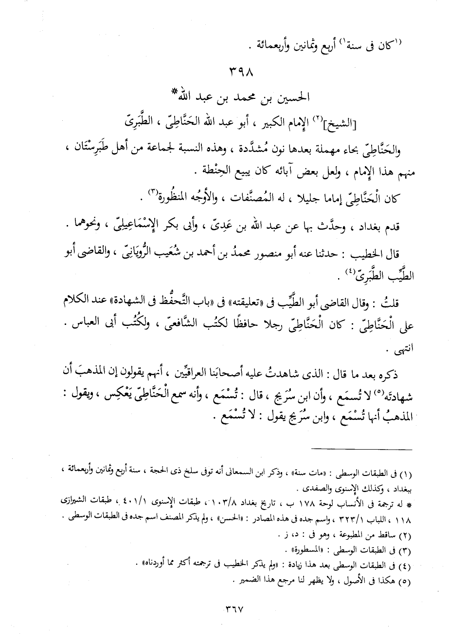 قلت وَقَالَ القَاضِي أَبُو الطّيب فِي تعليقته فِي بَاب التحفظ فِي الشَّهَادَة عِنْد الْكَلَام على الحناطي كَانَ الحناطي رجلا حَافِظًا لكتب الشَّافِعِي ولكتب أبي الْعَبَّاس