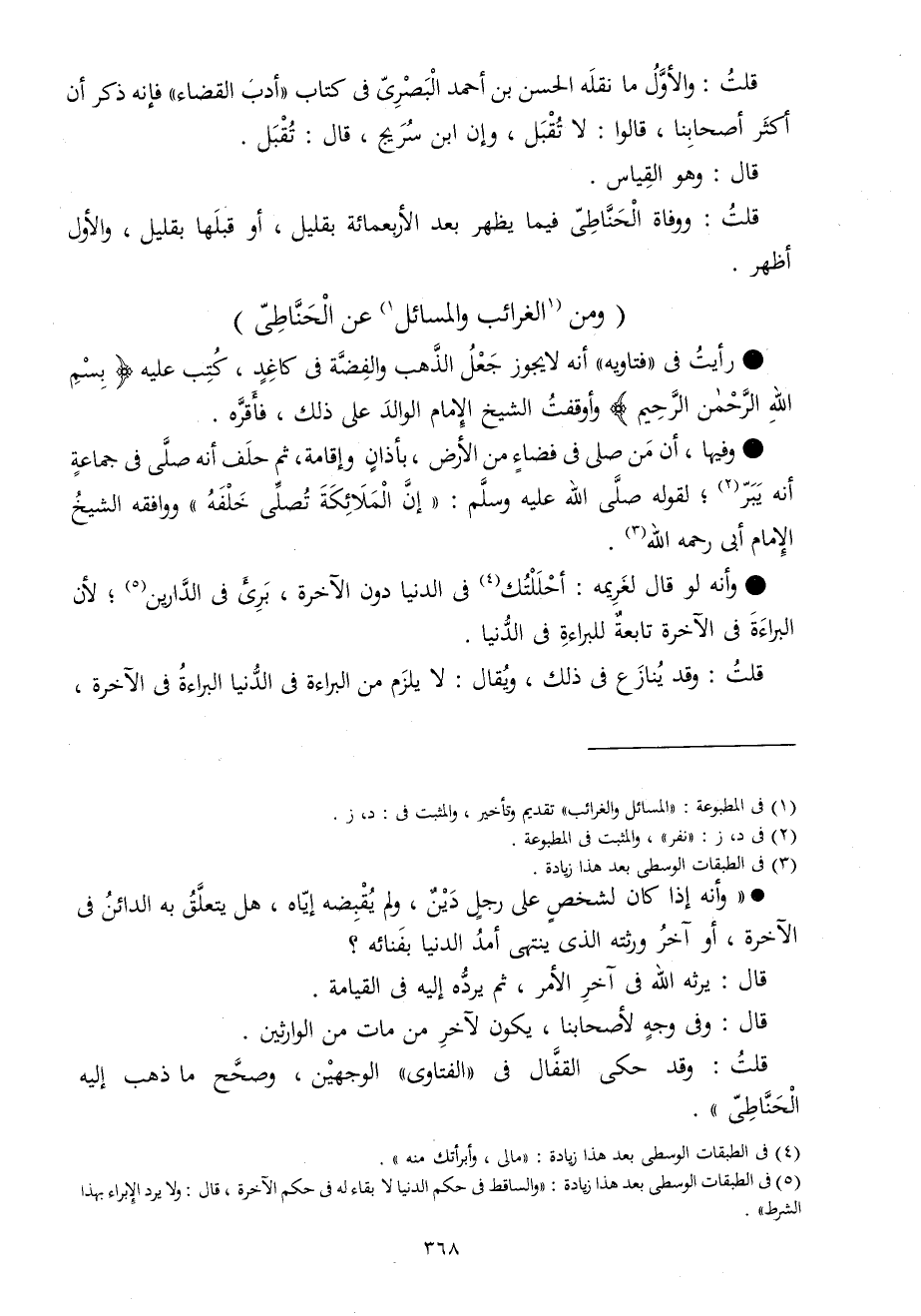 قلت ووفاة الحناطي فِيمَا يظْهر بعد الأربعمائة بِقَلِيل أَو قبلهَا بِقَلِيل وَالْأول أظهر