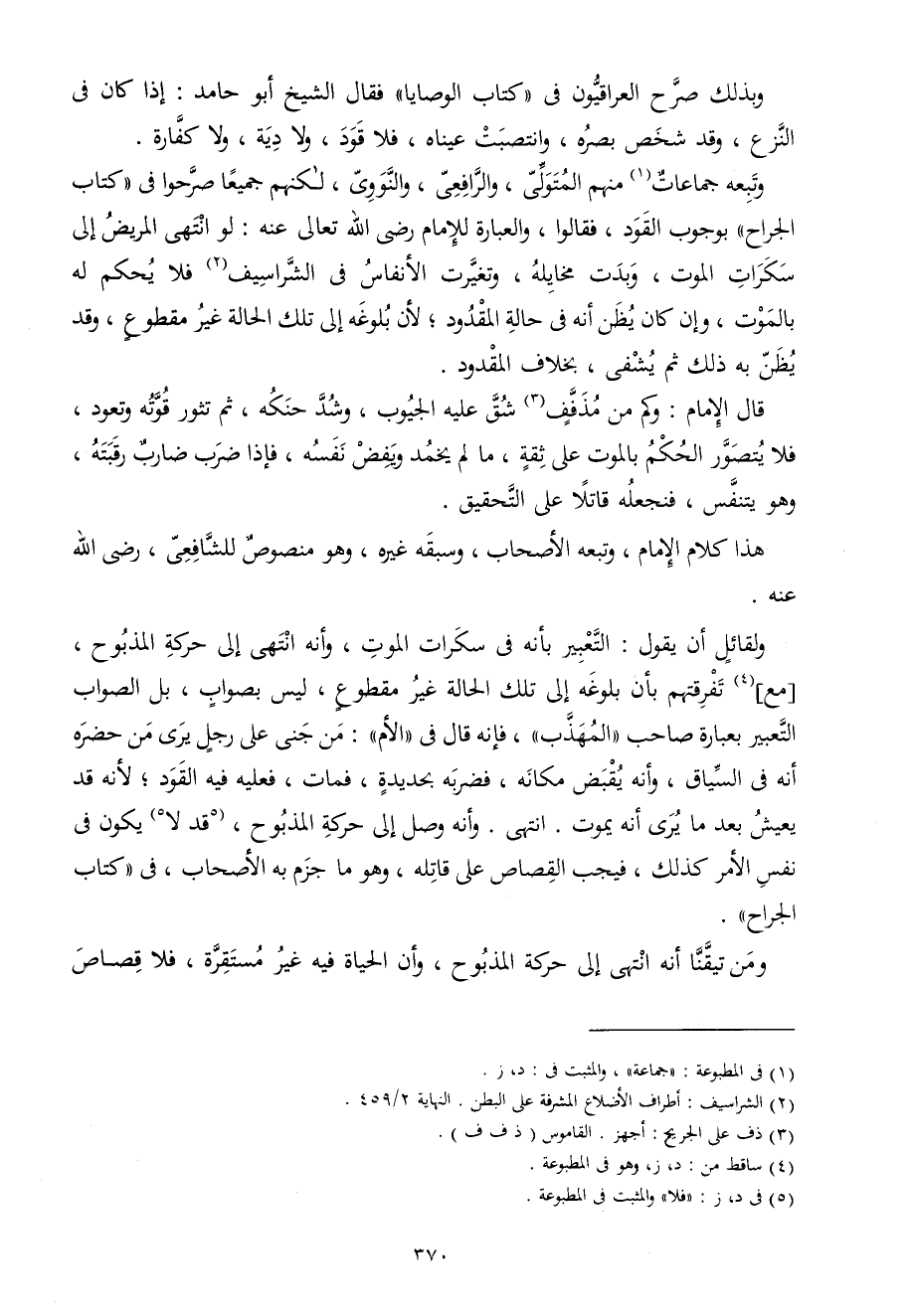 وَتَبعهُ جماعات مِنْهُم الْمُتَوَلِي والرافعي وَالنَّوَوِيّ لكِنهمْ جَمِيعًا صَرَّحُوا فِي كتاب الْجراح بِوُجُوب الْقود فَقَالُوا والعبارة للْإِمَام رَضِي الله تَعَالَى عَنهُ لَو انْتهى الْمَرِيض إِلَى سَكَرَات الْمَوْت وبدت مخايله وتغيرت الأنفاس فِي الشراسيف فَلَا يحكم لَهُ بِالْمَوْتِ وَإِن كَانَ يظنّ أَنه فِي حَالَة المقدود لِأَن بُلُوغه إِلَى تِلْكَ الْحَالة غير مَقْطُوع وَقد يظنّ بِهِ ذَلِك ثمَّ يشفى بِخِلَاف المقدود