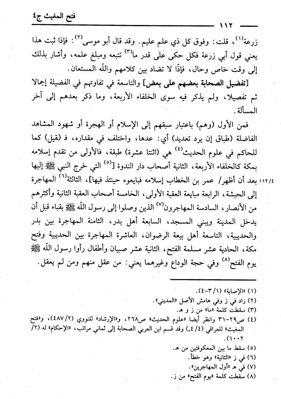 فَمِنَ الْأَوَّلِ: (وَهُمْ) بِاعْتِبَارِ سَبْقِهِمْ إِلَى الْإِسْلَامِ أَوِ الْهِجْرَةِ أَوْ شُهُودِ الْمَشَاهِدِ الْفَاضِلَةِ (طِبَاقٌ إِنْ يُرَدْ تَعْدِيدُ) ; أَيْ: عَدُّهَا. وَاخْتُلِفَ فِي مِقْدَارِهِ، فَـ (قِيلَ) كَمَا لِلْحَاكِمِ فِي (عُلُومِ الْحَدِيثِ) : هِيَ (اثْنَتَا عَشْرَةَ) طَبَقَةً. فَالْأُولَى: مَنْ تَقَدَّمَ إِسْلَامُهُ بِمَكَّةَ ; كَالْخُلَفَاءِ الْأَرْبَعَةِ. الثَّانِيَةُ: أَصْحَابُ دَارِ النَّدْوَةِ الَّتِي خَرَجَ النَّبِيُّ - صَلَّى اللَّهُ عَلَيْهِ وَسَلَّمَ - إِلَيْهَا بَعْدَ أَنْ أَظْهَرَ عُمَرُ بْنُ الْخَطَّابِ إِسْلَامَهُ، فَبَايَعُوهُ حِينَئِذٍ فِيهَا. الثَّالِثَةُ: الْمُهَاجِرَةُ إِلَى الْحَبَشَةِ. الرَّابِعَةُ: مُبَايِعَةُ الْعَقَبَةِ الْأُولَى. الْخَامِسَةُ: أَصْحَابُ الْعَقَبَةِ الثَّانِيَةِ، وَأَكْثَرُهُمْ مِنَ الْأَنْصَارِ. السَّادِسَةُ: الْمُهَاجِرُونَ الَّذِينَ وَصَلُوا إِلَى رَسُولِ اللَّهِ - صَلَّى اللَّهُ عَلَيْهِ وَسَلَّمَ - بِقُبَاءٍ قَبْلَ أَنْ يَدْخُلَ الْمَدِينَةَ وَيَبْنِيَ الْمَسْجِدَ. السَّابِعَةُ: أَهْلُ بَدْرٍ. الثَّامِنَةُ: الْمُهَاجِرَةُ بَيْنَ بَدْرٍ وَالْحُدَيْبِيَةِ. التَّاسِعَةُ: أَهْلُ بَيْعَةِ الرِّضْوَانِ. الْعَاشِرَةُ: الْمُهَاجِرَةُ بَيْنَ الْحُدَيْبِيَةِ وَفَتْحِ مَكَّةَ. الْحَادِيَةُ عَشَرَ: مُسْلِمَةُ الْفَتْحِ. الثَّانِيَةُ عَشَرَ: صِبْيَانٌ وَأَطْفَالٌ رَأَوْا رَسُولَ اللَّهِ - صَلَّى اللَّهُ عَلَيْهِ وَسَلَّمَ - يَوْمَ الْفَتْحِ وَفِي حَجَّةِ الْوَدَاعِ وَغَيْرِهِمَا، يَعْنِي مَنْ عَقَلَ مِنْهُمْ وَمَنْ لَمْ يَعْقِلْ.