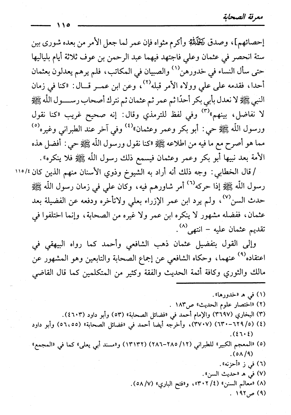 وَإِلَى الْقَوْلِ بِتَفْضِيلِ عُثْمَانَ ذَهَبَ الشَّافِعِيُّ وَأَحْمَدُ، كَمَا رَوَاهُ الْبَيْهَقِيُّ فِي اعْتِقَادِهِ عَنْهُمَا، وَحَكَاهُ الشَّافِعِيُّ عَنْ إِجْمَاعِ الصَّحَابَةِ وَالتَّابِعِينَ، وَهُوَ الْمَشْهُورُ عَنْ مَالِكٍ وَالثَّوْرِيِّ وَكَافَّةِ أَئِمَّةِ الْحَدِيثِ وَالْفِقْهِ وَكَثِيرٍ مِنَ الْمُتَكَلِّمِينَ كَمَا قَالَ الْقَاضِي