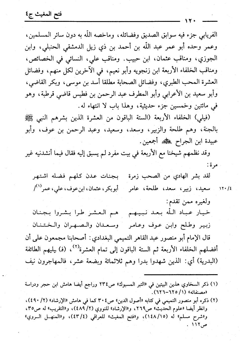 قَالَ الْإِمَامُ أَبُو مَنْصُورٍ عَبْدُ الْقَاهِرِ التَّمِيمِيُّ الْبَغْدَادِيُّ: أَصْحَابُنَا مُجْمِعُونَ عَلَى أَنَّ أَفْضَلَهُمُ الْخُلَفَاءُ الْأَرْبَعَةُ، ثُمَّ السِّتَّةُ الْبَاقُونَ إِلَى تَمَامِ الْعَشَرَةِ. (فَـ) يَلِيهِمِ الطَّائِفَةُ (الْبَدْرِيَّهْ) أَيْ: الَّذِينَ شَهِدُوا بَدْرًا، وَهُمْ ثَلَاثُمِائَةٍ وَبِضْعَةَ عَشَرَ، فَالْمُهَاجِرُونَ نَيِّفٌ