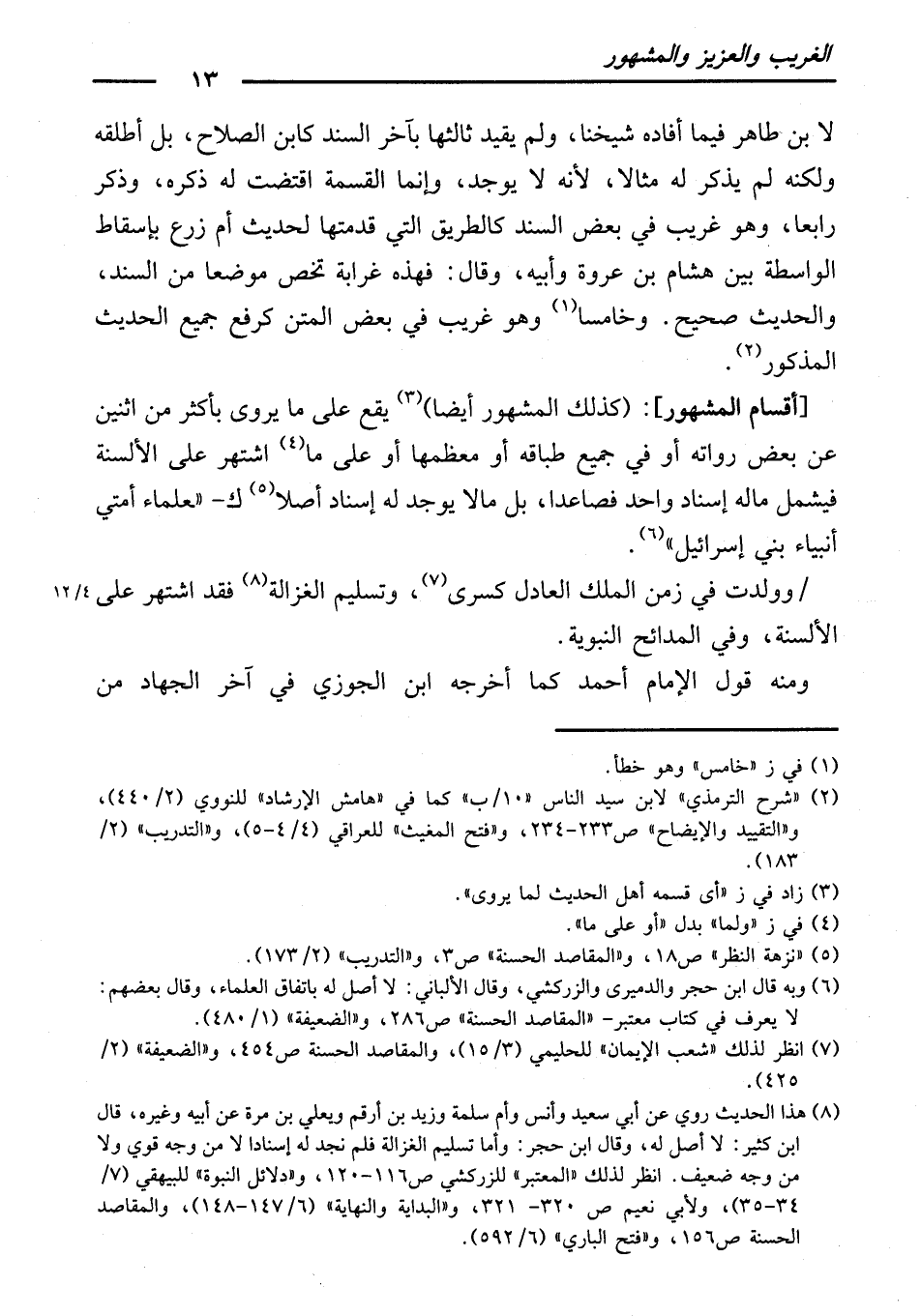 [أَقْسَامُ الْمَشْهُورِ] : (كَذَلِكَ الْمَشْهُورُ أَيْضًا) يَقَعُ عَلَى مَا يُرْوَى بِأَكْثَرَ مِنَ اثْنَيْنِ عَنْ بَعْضِ رُوَاتِهِ أَوْ فِي جَمِيعِ طِبَاقِهِ أَوْ مُعْظَمِهَا، أَوْ عَلَى مَا اشْتَهَرَ عَلَى الْأَلْسِنَةِ، فَيَشْمَلُ مَا لَهُ إِسْنَادٌ وَاحِدٌ فَصَاعِدًا، بَلْ مَا لَا يُوجَدُ لَهُ إِسْنَادٌ أَصْلًا ; كَـ: ( «عُلَمَاءُ أُمَّتِي أَنْبِيَاءُ بَنِي إِسْرَائِيلَ» ) ، وَ: ( «وُلِدْتُ فِي زَمَنِ الْمَلِكِ الْعَادِلِ كِسْرَى» ) ، وَتَسْلِيمِ الْغَزَالَةِ ; فَقَدِ اشْتَهَرَ عَلَى الْأَلْسِنَةِ وَفِي الْمَدَائِحِ النَّبَوِيَّةِ.