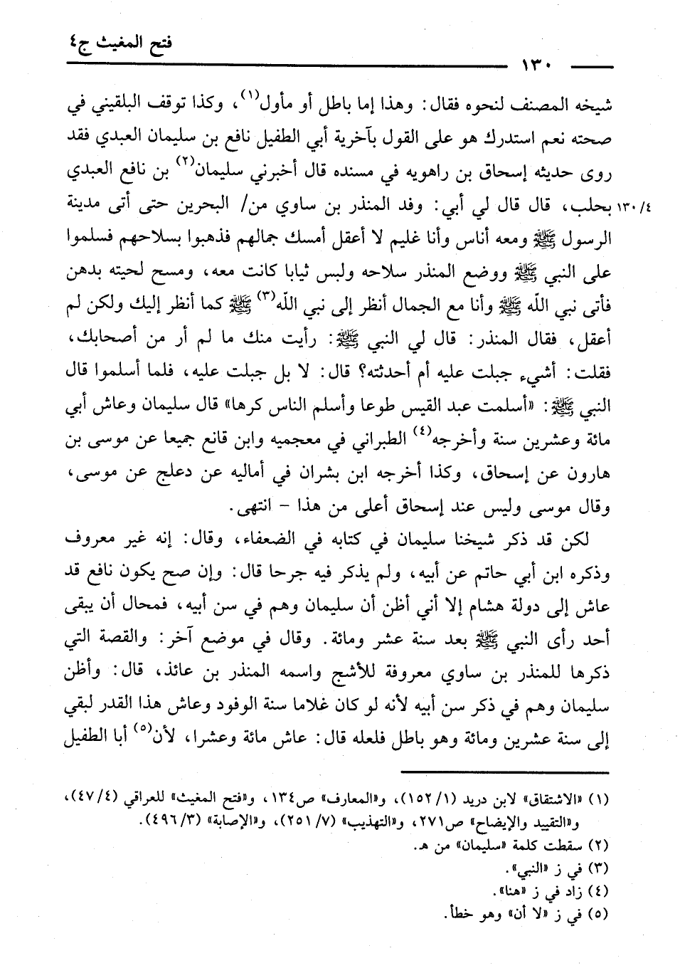 شَيْخُهُ الْمُصَنِّفُ لِنَحْوِهِ فَقَالَ: وَهَذَا إِمَّا بَاطِلٌ أَوْ مُؤَوَّلٌ. وَكَذَا تَوَقَّفَ الْبُلْقِينِيُّ فِي صِحَّتِهِ. نَعَمْ، اسْتَدْرَكَ هُوَ عَلَى الْقَوْلِ بِآخِرِيَّةِ أَبِي الطُّفَيْلِ نَافِعَ بْنَ سُلَيْمَانَ الْعَبْدِيَّ ; فَقَدْ رَوَى حَدِيثَهُ إِسْحَاقُ ابْنُ رَاهَوَيْهِ فِي مُسْنَدِهِ قَالَ: أَخْبَرَنِي سُلَيْمَانُ بْنُ نَافِعٍ الْعَبْدِيُّ بِحَلَبٍ قَالَ: «قَالَ لِي أَبِي: وَفَدَ الْمُنْذِرُ بْنُ سَاوَى مِنَ الْبَحْرَيْنِ حَتَّى أَتَى مَدِينَةَ الرَّسُولِ - صَلَّى اللَّهُ عَلَيْهِ وَسَلَّمَ - وَمَعَهُ أُنَاسٌ، وَأَنَا غُلَيْمٌ لَا أَعْقِلُ، أُمْسِكُ جِمَالَهُمْ، فَذَهَبُوا بِسِلَاحِهِمْ فَسَلَّمُوا عَلَى النَّبِيِّ - صَلَّى اللَّهُ عَلَيْهِ وَسَلَّمَ -، وَوَضَعَ الْمُنْذِرُ سِلَاحَهُ وَلَبِسَ ثِيَابًا كَانَتْ مَعَهُ، وَمَسَحَ لِحْيَتَهُ بِدُهْنٍ، فَأَتَى نَبِيَّ اللَّهِ - صَلَّى اللَّهُ عَلَيْهِ وَسَلَّمَ -، وَأَنَا مَعَ الْجِمَالِ أَنْظُرُ إِلَى نَبِيِّ اللَّهِ - صَلَّى اللَّهُ عَلَيْهِ وَسَلَّمَ - كَمَا أَنْظُرُ إِلَيْكَ، وَلَكِنْ لَمْ أَعْقِلْ، فَقَالَ الْمُنْذِرُ: قَالَ لِيَ النَّبِيُّ - صَلَّى اللَّهُ عَلَيْهِ وَسَلَّمَ -: (رَأَيْتُ مِنْكَ مَا لَمْ أَرَ مِنْ أَصْحَابِكَ) ، فَقُلْتُ: أَشَيْءٌ جُبِلْتُ عَلَيْهِ أَمْ أَحْدَثْتُهُ؟ قَالَ: (لَا، بَلْ جُبِلْتَ عَلَيْهِ) . فَلَمَّا أَسْلَمُوا قَالَ النَّبِيُّ - صَلَّى اللَّهُ عَلَيْهِ وَسَلَّمَ -: (أَسْلَمَتْ عَبْدُ الْقَيْسِ طَوْعًا، وَأَسْلَمَ النَّاسُ كَرْهًا) » .