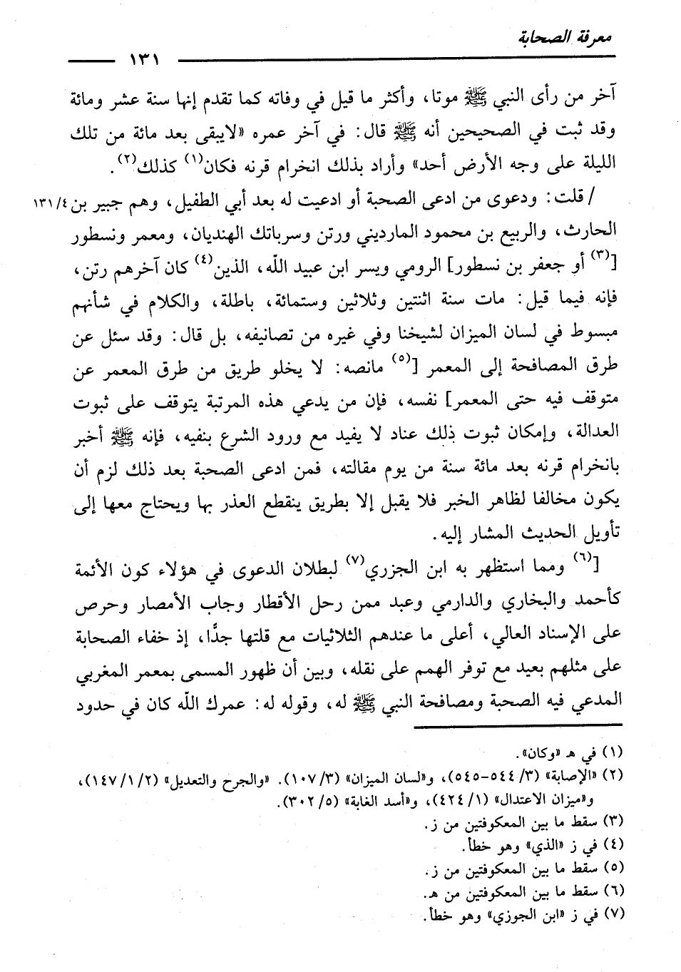 آخِرُ مَنْ رَأَى النَّبِيَّ - صَلَّى اللَّهُ عَلَيْهِ وَسَلَّمَ - مَوْتًا، وَأَكْثَرُ مَا قِيلَ فِي وَفَاتِهِ كَمَا تَقَدَّمَ: إِنَّهَا سَنَةَ عَشْرٍ وَمِائَةٍ. وَقَدْ ثَبَتَ فِي الصَّحِيحَيْنِ أَنَّهُ - صَلَّى اللَّهُ عَلَيْهِ وَسَلَّمَ - قَالَ فِي آخِرِ عُمُرِهِ: (لَا «يَبْقَى بَعَدَ مِائَةٍ مِنْ تِلْكَ اللَّيْلَةِ عَلَى وَجْهِ الْأَرْضِ أَحَدٌ» ) . وَأَرَادَ بِذَلِكَ انْخِرَامَ قَرْنِهِ، فَكَانَ كَذَلِكَ. قُلْتُ: وَدَعْوَى مَنِ ادَّعَى الصُّحْبَةَ أَوِ ادُّعِيَتْ لَهُ بَعْدَ أَبِي الطُّفَيْلِ، وَهُمْ جُبَيْرُ بْنُ الْحَارِثِ، وَالرَّبِيعُ بْنُ مَحْمُودٍ الْمَارِدِينِيُّ، وَرَتَنٌ وَسَرَبَاتِكُ الْهِنْدِيَّانِ، وَمَعْمَرٌ، وَنُسْطُورٌ أَوْ جَعْفَرُ بْنُ نُسْطُورٍ الرُّومِيُّ، وَيُسْرُ بْنُ عُبَيْدِ اللَّهِ، الَّذِينَ كَانَ آخِرَهُمْ رَتَنٌ ; فَإِنَّهُ فِيمَا قِيلَ: مَاتَ سَنَةَ اثْنَتَيْنِ وَثَلَاثِينَ وَسِتِّمِائَةٍ - بَاطِلَةٌ. وَالْكَلَامُ فِي شَأْنِهِمْ مَبْسُوطٌ فِي (لِسَانِ الْمِيزَانِ) لِشَيْخِنَا، وَفِي غَيْرِهِ مِنْ تَصَانِيفِهِ. بَلْ قَالَ، وَقَدْ سُئِلَ عَنْ طُرُقِ الْمُصَافَحَةِ إِلَى الْمُعَمَّرِ مَا نَصُّهُ: لَا يَخْلُو طَرِيقٌ مِنْ طُرُقِ الْمُعَمَّرِ عَنْ مُتَوَقِّفٍ فِيهِ حَتَّى الْمُعَمَّرِ] نَفْسِهِ ; فَإِنَّ مَنْ يَدَّعِي هَذِهِ الرُّتْبَةَ يَتَوَقَّفُ عَلَى ثُبُوتِ الْعَدَالَةِ، وَإِمْكَانُ ثُبُوتِ ذَلِكَ عِنَادٌ لَا يُفِيدُ مَعَ وُرُودِ الشَّرْعِ بِنَفْيِهِ ; فَإِنَّهُ - صَلَّى اللَّهُ عَلَيْهِ وَسَلَّمَ - أَخْبَرَ بِانْخِرَامِ قَرْنِهِ بَعْدَ مِائَةِ سَنَةٍ مِنْ يَوْمِ مَقَالَتِهِ.