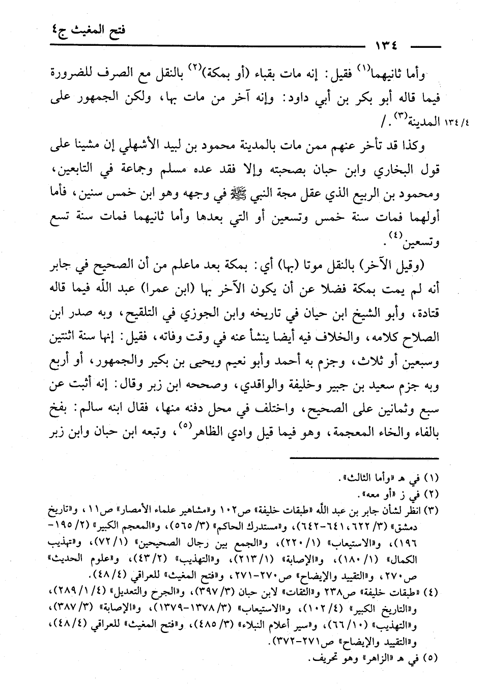 (وَقِيلَ: الَاخِرُ) بِالنَّقْلِ مَوْتًا (بِهَا) ; أَيْ: بِمَكَّةَ بَعْدَ مَا عُلِمَ مِنْ أَنَّ الصَّحِيحَ فِي جَابِرٍ أَنَّهُ لَمْ يَمُتْ بِمَكَّةَ، فَضْلًا عَنْ أَنْ يَكُونَ الْآخِرَ بِهَا، (ابْنُ عُمَرَا) عَبْدُ اللَّهِ، فِيمَا قَالَهُ قَتَادَةُ، وَأَبُو الشَّيْخِ ابْنُ حَيَّانَ فِي تَارِيخِهِ، وَابْنُ الْجَوْزِيِّ فِي (التَّلْقِيحِ) . وَبِهِ صَدَّرَ ابْنُ الصَّلَاحِ كَلَامَهُ. وَالْخِلَافُ فِيهِ أَيْضًا يَنْشَأُ عَنْهُ فِي وَقْتِ وَفَاتِهِ، فَقِيلَ: إِنَّهَا سَنَةَ اثْنَتَيْنِ وَسَبْعِينَ أَوْ ثَلَاثٍ، وَجَزَمَ بِهِ أَحْمَدُ وَأَبُو نُعَيْمٍ وَيَحْيَى بْنُ بُكَيْرٍ وَالْجُمْهُورُ. أَوْ أَرْبَعٍ، وَبِهِ جَزَمَ سَعِيدُ بْنُ جُبَيْرٍ وَخَلِيفَةُ وَالْوَاقِدِيُّ، وَصَحَّحَهُ ابْنُ زَبْرٍ، وَقَالَ: إِنَّهُ أُثْبِتَ عَنْ سَبْعٍ وَثَمَانِينَ عَلَى الصَّحِيحِ. وَاخْتُلِفَ فِي مَحَلِّ دَفْنِهِ مِنْهَا، فَقَالَ ابْنُهُ سَالِمٌ: بِفَخٍّ، بِالْفَاءِ وَالْخَاءِ الْمُعْجَمَةِ، وَهُوَ فِيمَا قِيلَ وَادِي الظَّاهِرِ. وَتَبِعَهُ ابْنُ حِبَّانَ وَابْنُ زَبْرٍ