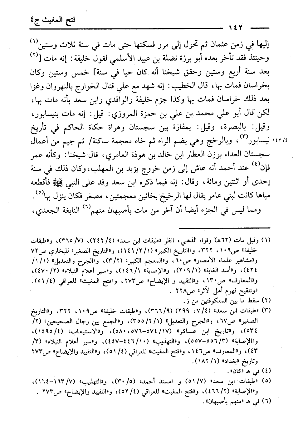 إِلَيْهَا فِي زَمَنِ عُثْمَانَ، ثُمَّ تَحَوَّلَ إِلَى مَرْوَ فَسَكَنَهَا حَتَّى مَاتَ فِي سَنَةِ ثَلَاثٍ وَسِتِّينَ. وَحِينَئِذٍ فَقَدْ تَأَخَّرَ بَعْدَهُ أَبُو بَرْزَةَ نَضْلَةُ بْنُ عُبَيْدٍ الْأَسْلَمِيُّ ; لِقَوْلِ خَلِيفَةَ: إِنَّهُ مَاتَ بَعْدَ سَنَةِ أَرْبَعٍ وَسِتِّينَ. وَحَقَّقَ شَيْخُنَا أَنَّهُ كَانَ حَيًّا فِي سَنَةِ خَمْسٍ وَسِتِّينَ، وَكَانَ بِخُرَاسَانَ فَمَاتَ بِهَا. قَالَ الْخَطِيبُ: إِنَّهُ شَهِدَ مَعَ عَلِيٍّ قِتَالَ الْخَوَارِجِ بِالنَّهْرَوَانِ، وَغَزَا بَعْدَ ذَلِكَ خُرَاسَانَ فَمَاتَ بِهَا. وَكَذَا جَزَمَ خَلِيفَةُ وَالْوَاقِدِيُّ وَابْنُ سَعْدٍ بِأَنَّهُ مَاتَ بِهَا. لَكِنْ قَالَ أَبُو عَلِيٍّ مُحَمَّدُ بْنُ عَلِيِّ بْنِ حَمْزَةَ الْمَرْوَزِيُّ: قِيلَ: إِنَّهُ مَاتَ بِنَيْسَابُورَ. وَقِيلَ: بِالْبَصْرَةِ. وَقِيلَ: بِمَفَازَةٍ بَيْنَ سِجِسْتَانَ وَهَرَاةَ. حَكَاهُ الْحَاكِمُ فِي (تَارِيخِ نَيْسَابُورَ) . وَبِالرُّخْجِ، وَهِيَ بِضَمِّ الرَّاءِ ثُمَّ خَاءٍ مُعْجَمَةٍ سَاكِنَةٍ ثُمَّ جِيمٍ، مِنْ أَعْمَالِ سَجِسْتَانَ، الْعَدَّاءُ - بِوَزْنِ الْعَطَّارِ - بْنُ خَالِدِ بْنِ هَوْذَةَ الْعَامِرِيُّ. قَالَ شَيْخُنَا: وَكَأَنَّهُ عُمِّرَ ; فَإِنَّ عِنْدَ أَحْمَدَ أَنَّهُ عَاشَ إِلَى زَمَنِ خُرُوجِ يَزِيدَ بْنِ الْمُهَلَّبِ، وَكَانَ ذَلِكَ فِي سَنَةِ إِحْدَى أَوِ اثْنَتَيْنِ وَمِائَةٍ. وَقَالَ: إِنَّهُ فِيمَا ذَكَرَهُ ابْنُ سَعْدٍ وَفَدَ عَلَى النَّبِيِّ - صَلَّى اللَّهُ عَلَيْهِ وَسَلَّمَ - فَأَقْطَعَهُ مِيَاهًا كَانَتْ لِبَنِي عَامِرٍ يُقَالُ لَهَا: الرُّخَيْخُ، بِخَائَيْنِ مُعْجَمَتَيْنِ مُصَغَّرٌ، فَكَانَ يَنْزِلُ بِهَا. وَمِمَّا لَيْسَ فِي الْجُزْءِ أَيْضًا أَنَّ آخِرَ مَنْ مَاتَ بِأَصْبَهَانَ مِنْهُمُ النَّابِغَةُ الْجَعْدِيُّ ;