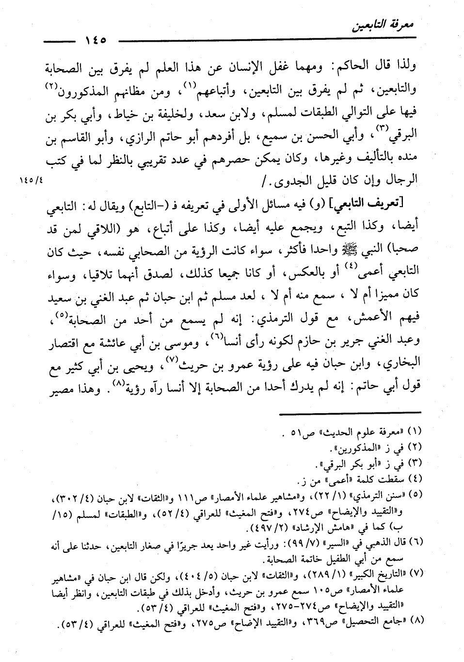 [تَعْرِيفُ التَّابِعِيِّ] (وَ) فِيهِ مَسَائِلُ: الْأُولَى: فِي تَعْرِيفِهِ، فَـ (التَّابِعُ) وَيُقَالَ لَهُ: التَّابِعِيُّ أَيْضًا، وَكَذَا التَّبَعُ، وَيُجْمَعُ عَلَيْهِ أَيْضًا، وَكَذَا عَلَى أَتْبَاعٍ، هُوَ (اللَّاقِي لِمَنْ قَدْ صَحِبَا) النَّبِيَّ - صَلَّى اللَّهُ عَلَيْهِ وَسَلَّمَ - وَاحِدًا فَأَكْثَرَ، سَوَاءٌ كَانَتِ الرُّؤْيَةُ مِنَ الصَّحَابِيِّ نَفْسِهِ، حَيْثُ كَانَ التَّابِعِيُّ أَعْمَى أَوْ بِالْعَكْسِ، أَوْ كَانَا جَمِيعًا كَذَلِكَ ; لَصَدَقَ أَنَّهُمَا تَلَاقَيَا، وَسَوَاءٌ كَانَ مُمَيِّزًا أَمْ لَا، سَمِعَ مِنْهُ أَمْ لَا ; لِعَدِّ مُسْلِمٍ ثُمَّ ابْنِ حِبَّانَ ثُمَّ عَبْدِ الْغَنِيِّ بْنِ سَعِيدٍ فِيهِمِ الْأَعْمَشَ، مَعَ قَوْلِ التِّرْمِذِيِّ: إِنَّهُ لَمْ يَسْمَعْ مِنْ أَحَدٍ مِنَ الصَّحَابَةِ. وَعَبْدِ الْغَنِيِّ جَرِيرَ بْنَ حَازِمٍ ; لِكَوْنِهِ رَأَى أَنَسًا. وَمُوسَى بْنَ أَبِي عَائِشَةَ مَعَ اقْتِصَارِ الْبُخَارِيِّ وَابْنِ حِبَّانَ فِيهِ عَلَى رُؤْيَةِ عَمْرِو بْنِ حُرَيْثٍ. وَيَحْيَى بْنِ أَبِي كَثِيرٍ مَعَ قَوْلِ أَبِي حَاتِمٍ: إِنَّهُ لَمْ يُدْرِكْ أَحَدًا مِنَ الصَّحَابَةِ إِلَّا أَنَسًا رَآهُ رُؤْيَةً. وَهَذَا مَصِيرٌ