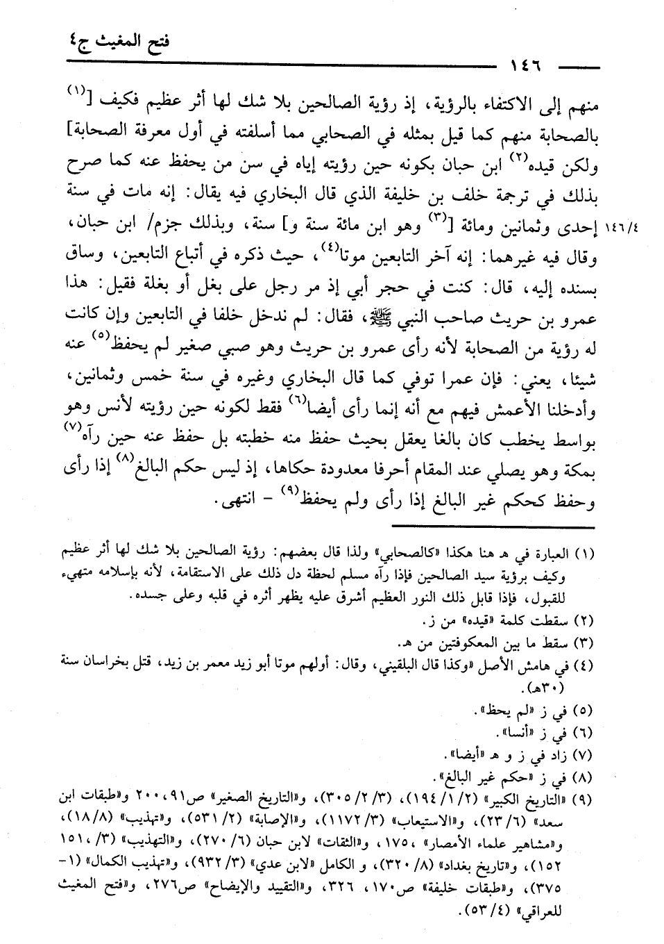 مِنْهُمْ إِلَى الِاكْتِفَاءِ بِالرُّؤْيَةِ ; إِذْ رُؤْيَةُ الصَّالِحِينَ - بِلَا شَكٍّ - لَهَا أَثَرٌ عَظِيمٌ، فَكَيْفَ بِالصَّحَابَةِ مِنْهُمْ؟ ! كَمَا قِيلَ بِمِثْلِهِ فِي الصَّحَابِيِّ مِمَّا أَسْلَفْتُهُ فِي أَوَّلِ مَعْرِفَةِ الصَّحَابَةِ. وَلَكِنْ قَيَّدَهُ ابْنُ حِبَّانَ بِكَوْنِهِ حِينَ رُؤْيَتِهِ إِيَّاهُ فِي سِنِّ مَنْ يَحْفَظُ عَنْهُ، كَمَا صَرَّحَ بِذَلِكَ فِي تَرْجَمَةِ خَلَفِ بْنِ خَلِيفَةَ الَّذِي قَالَ الْبُخَارِيُّ فِيهِ: يُقَالُ: إِنَّهُ مَاتَ فِي سَنَةِ إِحْدَى وَثَمَانِينَ وَمِائَةٍ، وَهُوَ ابْنُ مِائَةِ سَنَةٍ وَسَنَةٍ. وَبِذَلِكَ جَزَمَ ابْنُ حِبَّانَ. وَقَالَ فِيهِ غَيْرُهُمَا: إِنَّهُ آخِرُ التَّابِعِينَ مَوْتًا ; حَيْثُ ذَكَرَهُ فِي أَتْبَاعِ التَّابِعِينَ، وَسَاقَ بِسَنَدِهِ إِلَيْهِ قَالَ: كُنْتُ فِي حِجْرِ أَبِي إِذْ مَرَّ رَجُلٌ عَلَى بَغْلٍ أَوْ بَغْلَةٍ، فَقِيلَ: هَذَا عَمْرُو بْنُ حُرَيْثٍ صَاحِبُ النَّبِيِّ - صَلَّى اللَّهُ عَلَيْهِ وَسَلَّمَ -. فَقَالَ: لَمْ نُدْخِلْ خَلَفًا فِي التَّابِعِينَ وَإِنْ كَانَتْ لَهُ رُؤْيَةٌ مِنَ الصَّحَابَةِ ; لِأَنَّهُ رَأَى عَمْرَو بْنَ حُرَيْثٍ وَهُوَ صَبِيٌّ صَغِيرٌ لَمْ يَحْفَظْ عَنْهُ شَيْئًا، يَعْنِي فَإِنَّ عَمْرًا تُوُفِّيَ - كَمَا قَالَ الْبُخَارِيُّ وَغَيْرُهُ - فِي سَنَةِ خَمْسٍ وَثَمَانِينَ. وَأَدْخَلْنَا الْأَعْمَشَ فِيهِمْ، مَعَ أَنَّهُ إِنَّمَا رَأَى أَيْضًا فَقَطْ ; لِكَوْنِهِ حِينَ رُؤْيَتِهِ لِأَنَسٍ وَهُوَ بِوَاسِطٍ يَخْطُبُ كَانَ بَالِغًا يَعْقِلُ، بِحَيْثُ حَفِظَ مِنْهُ خُطْبَتَهُ، بَلْ حَفِظَ عَنْهُ حِينَ رَآهُ بِمَكَّةَ وَهُوَ يُصَلِّي عِنْدَ الْمَقَامِ أَحْرُفًا مَعْدُودَةً حَكَاهَا ; إِذْ لَيْسَ حُكْمُ الْبَالِغِ إِذَا رَأَى وَحَفِظَ كَحُكْمِ غَيْرِ الْبَالِغِ إِذَا رَأَى وَلَمْ يَحْفَظْ. انْتَهَى.