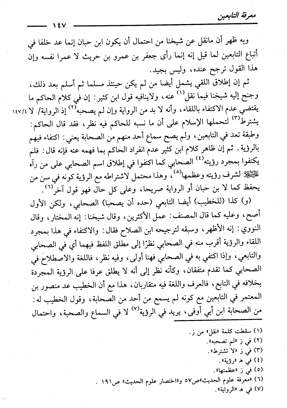 ثُمَّ إِنَّ إِطْلَاقَ اللُّقِيِّ يَشْمَلُ أَيْضًا مَنْ لَمْ يَكُنْ حِينَئِذٍ مُسْلِمًا ثُمَّ أَسْلَمَ بَعْدَ ذَلِكَ، وَجَنَحَ إِلَيْهِ شَيْخُنَا فِيمَا نُقِلَ عَنْهُ. وَلَا يُنَافِيهِ قَوْلُ ابْنِ كَثِيرٍ: إِنَّ فِي كَلَامِ الْحَاكِمِ مَا يَقْتَضِي عَدَمَ الِاكْتِفَاءِ بِاللِّقَاءِ، وَأَنَّهُ لَا بُدَّ مِنَ الرِّوَايَةِ وَإِنْ لَمْ يَصْحَبْهُ ; إِذِ الرِّوَايَةُ لَا يُشْتَرَطُ لِتَحَمُّلِهَا الْإِسْلَامُ. عَلَى أَنَّ مَا نَسَبَهُ لِلْحَاكِمِ فِيهِ نَظَرٌ ; فَقَدْ قَالَ الْحَاكِمُ: وَطَبَقَةٌ تُعَدُّ فِي التَّابِعِينَ وَلَمْ يَصِحَّ سَمَاعُ أَحَدٍ مِنْهُمْ مِنَ الصَّحَابَةِ ; يَعْنِي اكْتِفَاءً فِيهِمْ بِالرُّؤْيَةِ. ثُمَّ إِنَّ ظَاهِرَ كَلَامِ ابْنِ كَثِيرٍ عَدَمُ انْفِرَادِ الْحَاكِمِ بِمَا فَهِمَهُ عَنْهُ ; فَإِنَّهُ قَالَ: فَلَمْ يَكْتَفُوا بِمُجَرَّدِ رُؤْيَتِهِ الصَّحَابِيَّ، كَمَا اكْتَفَوْا فِي إِطْلَاقِ اسْمِ الصَّحَابِيِّ عَلَى مَنْ رَآهُ عَلَيْهِ السَّلَامُ لِشَرَفِ رُؤْيَتِهِ وَعِظَمِهَا. وَهَذَا مُحْتَمَلٌ لِاشْتِرَاطِهِ مَعَ الرُّؤْيَةِ كَوْنَهُ فِي سِنِّ مَنْ يَحْفَظُ، كَمَا لِابْنِ حِبَّانَ، أَوِ الرِّوَايَةَ صَرِيحًا. وَعَلَى كُلِّ حَالٍ فَهُوَ قَوْلٌ آخَرُ.