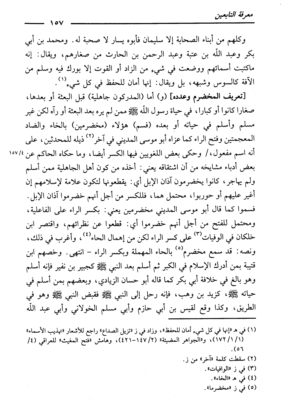 [تَعْرِيفُ الْمُخَضْرَمِ وَعَدَدُهُ] (وَ) أَمَّا (الْمُدْرِكُونَ جَاهِلِيَّةً) قَبْلَ الْبَعْثَةِ أَوْ بَعْدَهَا، صِغَارًا كَانُوا أَوْ كِبَارًا، فِي حَيَاةِ رَسُولِ اللَّهِ - صَلَّى اللَّهُ عَلَيْهِ وَسَلَّمَ - مِمَّنْ لَمْ يَرَهُ بَعْدَ الْبَعْثَةِ، أَوْ رَآهُ لَكِنْ غَيْرَ مُسْلِمٍ، وَأَسْلَمَ فِي حَيَاتِهِ أَوْ بَعْدَهُ، (فَسَمْ) هَؤُلَاءِ (مُخَضْرَمِينَ) بِالْخَاءِ وَالضَّادِ الْمُعْجَمَتَيْنِ وَفَتْحِ الرَّاءِ، كَمَا عَزَاهُ أَبُو مُوسَى الْمَدِينِيُّ فِي آخِرِ ذَيْلِهِ لِلْمُحَدِّثِينَ، عَلَى أَنَّهُ اسْمُ مَفْعُولٍ. وَحَكَى بَعْضُ اللُّغَوِيِّينَ فِيهَا بِالْكَسْرِ أَيْضًا. وَمَا حَكَاهُ الْحَاكِمُ عَنْ بَعْضِ أُدَبَاءِ مَشَايِخِهِ مِنْ أَنَّ اشْتِقَاقَهُ - يَعْنِي أَخْذَهُ - مِنْ كَوْنِ أَهْلِ الْجَاهِلِيَّةِ مِمَّنْ أَسْلَمَ وَلَمْ يُهَاجِرْ كَانُوا يُخَضْرِمُونَ آذَانَ الْإِبِلِ ; أَيْ: يَقْطَعُونَهَا ; لِتَكُونَ عَلَامَةً لِإِسْلَامِهِمْ إِنْ أُغِيرَ عَلَيْهِمْ أَوْ حُورِبُوا، مُحْتَمِلٌ لَهُمَا. فَلِلْكَسْرِ مِنْ أَجْلِ أَنَّهُمْ خَضْرَمُوا آذَانَ الْإِبِلِ، فَسُمُّوا - كَمَا قَالَ أَبُو مُوسَى الْمَدِينِيُّ - مُخَضْرِمِينَ، يَعْنِي بِكَسْرِ الرَّاءِ عَلَى الْفَاعِلِيَّةِ، وَمُحْتَمِلٌ لِلْفَتْحِ مِنْ أَجْلِ أَنَّهُمْ خُضْرِمُوا ; أَيْ: قُطِعُوا عَنْ نُظَرَائِهِمْ. وَاقْتَصَرَ ابْنُ خَلِّكَانَ فِي الْوَفَيَاتِ عَلَى كَسْرِ الرَّاءِ، لَكِنْ مِنْ إِهْمَالِ الْحَاءِ، وَأَغْرَبَ فِي ذَلِكَ، وَنَصُّهُ: قَدْ سُمِعَ مُحَضْرِمٌ بِالْحَاءِ الْمُهْمَلَةِ وَبِكَسْرِ الرَّاءِ. انْتَهَى.