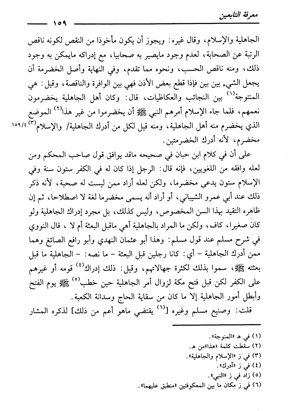 عَلَى أَنَّ فِي كَلَامِ ابْنِ حِبَّانَ فِي (صَحِيحِهِ) مَا قَدْ يُوَافِقُ قَوْلَ صَاحِبِ (الْمُحْكَمِ) . وَمَنْ لَعَلَّهُ وَافَقَهُ مِنَ اللُّغَوِيِّينَ فَإِنَّهُ قَالَ: الرَّجُلُ إِذَا كَانَ لَهُ فِي الْكُفْرِ سِتُّونَ سَنَةً، وَفِي الْإِسْلَامِ سِتُّونَ يُدْعَى مُخَضْرَمًا. وَلَكِنْ لَعَلَّهُ أَرَادَ مِمَّنْ لَيْسَتْ لَهُ صُحْبَةٌ ; لِأَنَّهُ ذَكَرَ ذَلِكَ عِنْدَ أَبِي عَمْرٍو الشَّيْبَانِيِّ. أَوْ أَرَادَ أَنَّهُ يُسَمَّى مُخَضْرَمًا لُغَةً، لَا اصْطِلَاحًا. ثُمَّ إِنَّ ظَاهِرَهُ التَّقَيُّدُ بِهَذَا السِّنِّ الْمَخْصُوصِ، وَلَيْسَ كَذَلِكَ، بَلْ مُجَرَّدُ إِدْرَاكِ الْجَاهِلِيَّةِ وَلَوْ كَانَ صَغِيرًا كَافٍ. وَلَكِنْ مَا الْمُرَادُ بِالْجَاهِلِيَّةِ؟ أَهِيَ مَا قَبْلَ الْبَعْثَةِ أَمْ لَا؟ قَالَ النَّوَوِيُّ فِي (شَرْحِ مُسْلِمٍ) عِنْدَ قَوْلِ مُسْلِمٍ: وَهَذَا أَبُو عُثْمَانَ النَّهْدِيُّ وَأَبُو رَافِعٍ الصَّائِغُ، وَهُمَا مِمَّنْ أَدْرَكَ الْجَاهِلِيَّةَ ; أَيْ: كَانَا رَجُلَيْنِ قَبْلَ الْبَعْثَةِ، مَا نَصُّهُ: وَالْجَاهِلِيَّةُ مَا قَبْلَ بَعْثَتِهِ - صَلَّى اللَّهُ عَلَيْهِ وَسَلَّمَ -، سُمُّوا بِذَلِكَ لِكَثْرَةِ جَهَالَاتِهِمْ. وَقِيلَ: ذَلِكَ إِدْرَاكُ قَوْمِهِ أَوْ غَيْرِهِمْ عَلَى الْكُفْرِ، لَكِنْ قَبْلَ فَتْحِ مَكَّةَ ; لِزَوَالِ أَمْرِ الْجَاهِلِيَّةِ حِينَ خَطَبَ - صَلَّى اللَّهُ عَلَيْهِ وَسَلَّمَ - يَوْمَ الْفَتْحِ وَأَبْطَلَ أُمُورَ الْجَاهِلِيَّةِ، إِلَّا مَا كَانَ مِنْ سِقَايَةِ الْحَاجِّ وَسَدَانَةِ الْكَعْبَةِ.