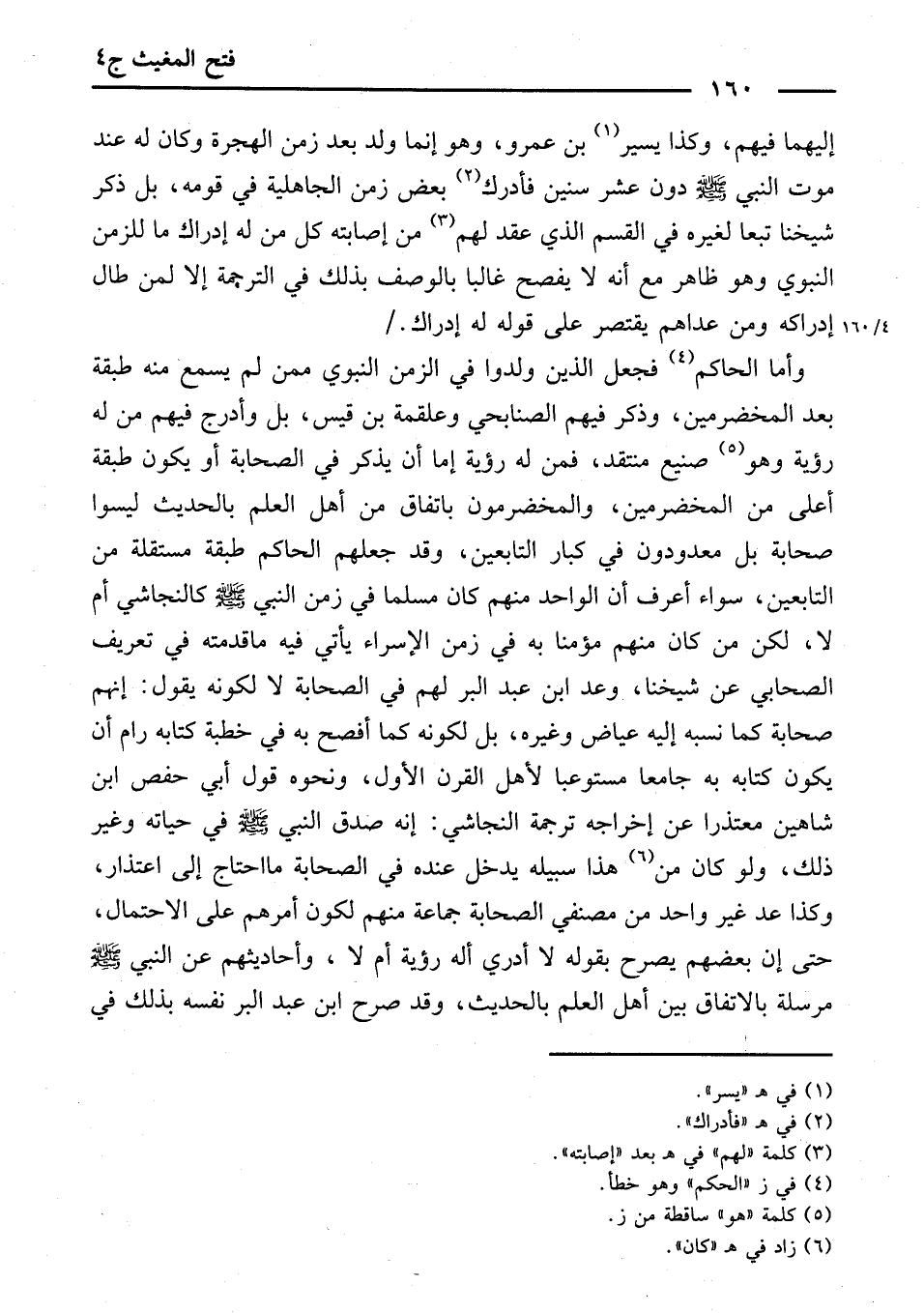وَأَمَّا الْحَاكِمُ، فَجَعَلَ الَّذِينَ وُلِدُوا فِي الزَّمَنِ النَّبَوِيِّ مِمَّنْ لَمْ يَسْمَعْ مِنْهُ طَبَقَةً بَعْدَ الْمُخَضْرَمِينَ، وَذَكَرَ فِيهِمِ الصُّنَابِحِيَّ وَعَلْقَمَةَ بْنَ قَيْسٍ. بَلْ وَأَدْرَجَ فِيهِمْ مَنْ لَهُ رُؤْيَةٌ، وَهُوَ صَنِيعٌ مُنْتَقَدٌ، فَمَنْ لَهُ رُؤْيَةٌ إِمَّا أَنْ يُذْكَرَ فِي الصَّحَابَةِ، أَوْ يَكُونَ طَبَقَةً أَعْلَى مِنَ الْمُخَضْرَمِينَ. وَالْمُخَضْرَمُونَ بِاتِّفَاقٍ مِنْ أَهْلِ الْعِلْمِ بِالْحَدِيثِ لَيْسُوا صَحَابَةً، بَلْ مَعْدُودُونَ فِي كِبَارِ التَّابِعِينَ. وَقَدْ جَعَلَهُمُ الْحَاكِمُ طَبَقَةً مُسْتَقِلَّةً مِنَ التَّابِعِينَ، سَوَاءٌ أَعُرِفَ أَنَّ الْوَاحِدَ مِنْهُمْ كَانَ مُسْلِمًا فِي زَمَنِ النَّبِيِّ - صَلَّى اللَّهُ عَلَيْهِ وَسَلَّمَ - ; كَالنَّجَاشِيِّ، أَمْ لَا. لَكِنْ مَنْ كَانَ مِنْهُمْ مُؤْمِنًا بِهِ فِي زَمَنِ الْإِسْرَاءِ يَأْتِي فِيهِ مَا قَدَّمْتُهُ فِي تَعْرِيفِ الصَّحَابِيِّ عَنْ شَيْخِنَا. وَعَدُّ ابْنِ عَبْدِ الْبَرِّ لَهُمْ فِي الصَّحَابَةِ، لَا لِكَوْنِهِ يَقُولُ: إِنَّهُمْ صَحَابَةٌ، كَمَا نَسَبَهُ إِلَيْهِ عِيَاضٌ وَغَيْرُهُ، بَلْ لِكَوْنِهِ كَمَا أَفْصَحَ بِهِ فِي خُطْبَةِ كِتَابِهِ رَامَ أَنْ يَكُونَ كِتَابُهُ بِهِ جَامِعًا مُسْتَوْعِبًا لِأَهْلِ الْقَرْنِ الْأَوَّلِ. وَنَحْوُهُ قَوْلُ أَبِي حَفْصِ بْنِ شَاهِينَ مُعْتَذِرًا عَنْ إِخْرَاجِهِ تَرْجَمَةَ النَّجَاشِيِّ: إِنَّهُ صَدَّقَ النَّبِيَّ - صَلَّى اللَّهُ عَلَيْهِ وَسَلَّمَ - فِي حَيَاتِهِ. وَغَيْرُ ذَلِكَ. وَلَوْ كَانَ مَنْ هَذَا سَبِيلُهُ يَدْخُلُ عِنْدَهُ فِي الصَّحَابَةِ مَا احْتَاجَ إِلَى اعْتِذَارٍ.