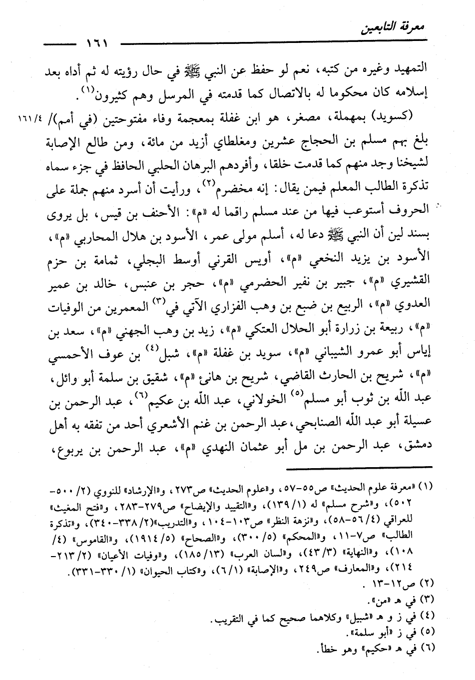 وَهُمْ كَثِيرُونَ ; (كَسُوَيْدٍ) بِمُهْمَلَةٍ مُصَغَّرٌ، وَابْنُ غَفَلَةَ بِمُعْجَمَةٍ وَفَاءٍ مَفْتُوحَتَيْنِ، (فِي أُمَمْ) بَلَغَ بِهِمْ مُسْلِمُ بْنُ الْحَجَّاجِ عِشْرِينَ، وَمُغَلْطَايْ أَزْيَدَ مِنْ مِائَةٍ. وَمَنْ طَالَعَ (الْإِصَابَةَ) لِشَيْخِنَا وَجَدَ مِنْهُمْ كَمَا قَدَّمْتُ خَلْقًا. وَأَفْرَدَهُمُ الْبُرْهَانُ الْحَلَبِيُّ الْحَافِظُ فِي جُزْءٍ سَمَّاهُ (تَذْكِرَةَ الطَّالِبِ الْمُعَلَّمُ فِيمَنْ يُقَالُ: إِنَّهُ مُخَضْرَمٌ) . وَرَأَيْتُ أَنْ أَسْرُدَ مِنْهُمْ جُمْلَةً عَلَى الْحُرُوفِ أَسْتَوْعِبُ فِيهَا مَنْ عِنْدَ مُسْلِمٍ، رَاقِمًا لَهُ (م) . الْأَحْنَفُ بْنُ قَيْسٍ، بَلْ يُرْوَى بِسَنَدٍ لَيِّنٍ أَنَّ النَّبِيَّ - صَلَّى اللَّهُ عَلَيْهِ وَسَلَّمَ - دَعَا لَهُ. أَسْلَمُ مَوْلَى عُمَرَ، الْأَسْوَدُ بْنُ هِلَالٍ الْمُحَارِبِيُّ (م) ، الْأَسْوَدُ بْنُ يَزِيدَ النَّخَعِيُّ (م) ، أُوَيْسٌ الْقَرَنِيُّ، أَوْسَطُ الْبَجَلِيُّ، ثُمَامَةُ بْنُ حَزْمٍ الْقُشَيْرِيُّ (م) ، جُبَيْرُ بْنُ نُفَيْرٍ الْحَضْرَمِيُّ (م) ، حُجْرُ بْنُ عَنْبَسٍ، خَالِدُ بْنُ عُمَيْرٍ الْعَدَوِيُّ (م) ، الرَّبِيعُ بْنُ ضَبُعِ بْنِ وَهْبٍ الْفَزَارِيُّ الْآتِي فِي الْمُعَمَّرِينَ بَيْنَ الْوَفَيَاتِ (م) ، رَبِيعَةُ بْنُ زُرَارَةَ، أَبُو الْحَلَالِ الْعَتَكِيُّ (م) ، زَيْدُ بْنُ وَهْبٍ الْجُهَنِيُّ (م) ، سَعْدُ بْنُ إِيَاسٍ أَبُو عَمْرٍو الشَّيْبَانِيُّ (م) ، سُوَيْدُ بْنُ غَفَلَةَ (م) ، شِبْلُ بْنُ عَوْفٍ الْأَحْمَسِيُّ (م) ، شُرَيْحُ بْنُ الْحَارِثِ الْقَاضِي، شُرَيْحُ بْنُ هَانِئٍ (م) ، شَقِيقُ بْنُ سَلَمَةَ أَبُو وَائِلٍ، عَبْدُ اللَّهِ بْنُ ثُوَبَ أَبُو مُسْلِمٍ الْخَوْلَانِيُّ، عَبْدُ اللَّهِ بْنُ عُكَيْمٍ، عَبْدُ الرَّحْمَنِ بْنُ عُسَيْلَةَ أَبُو عَبْدِ اللَّهِ الصُّنَابِحِيُّ، عَبْدُ الرَّحْمَنِ بْنُ غَنْمٍ الْأَشْعَرِيُّ أَحَدُ مَنْ تَفَقَّهَ بِهِ أَهْلُ دِمَشْقَ، عَبْدُ الرَّحْمَنِ بْنُ مُلٍّ أَبُو عُثْمَانَ النَّهْدِيُّ (م) ، عَبْدُ الرَّحْمَنِ بْنُ يَرْبُوعٍ،