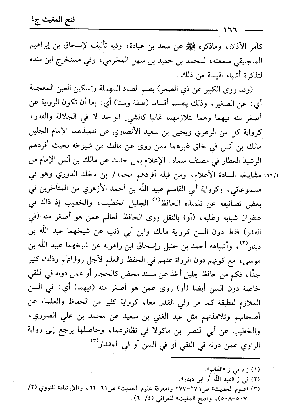 (اوْ) بِالنَّقْلِ، رَوَى الْحَافِظُ الْعَالِمُ عَمَّنْ هُوَ أَصْغَرُ مِنْهُ (فِي الْقَدْرِ) فَقَطْ دُونَ السِّنِّ ; كَرِوَايَةِ مَالِكٍ وَابْنِ أَبِي ذِئْبٍ عَنْ شَيْخِهِمَا عَبْدِ اللَّهِ بْنِ دِينَارٍ وَأَشْبَاهِهِ، وَأَحْمَدَ بْنِ حَنْبَلٍ وَإِسْحَاقَ بْنِ رَاهَوَيْهِ عَنْ شَيْخِهِمَا عُبَيْدِ اللَّهِ بْنِ مُوسَى، مَعَ كَوْنِهِمْ دُونَ الرُّوَاةِ عَنْهُمْ فِي الْحِفْظِ وَالْعِلْمِ ; لِأَجْلِ رِوَايَتِهِمْ. وَذَلِكَ كَثِيرٌ جِدًّا، فَكَمْ مِنْ حَافِظٍ جَلِيلٍ أَخَذَ عَنْ مُسْنِدٍ مَحْضٍ كَالْحَجَّارِ، أَوْ عَمَّنْ دُونَهُ فِي اللُّقِيِّ خَاصَّةً دُونَ السِّنِّ أَيْضًا. (أَوْ) رَوَى عَمَّنْ هُوَ أَصْغَرُ مِنْهُ (فِيهِمَا) ; أَيْ: فِي السَّنِّ الْمُلَازِمِ لِلطَّبَقَةِ كَمَا مَرَّ، وَفِي الْقَدْرِ مَعًا ; كَرِوَايَةِ كَثِيرٍ مِنَ الْحُفَّاظِ وَالْعُلَمَاءِ عَنْ أَصْحَابِهِمْ وَتَلَامِذَتِهِمْ ; مِثْلُ عَبْدِ الْغَنِيِّ بْنِ سَعِيدٍ عَنْ مُحَمَّدِ بْنِ عَلِيٍّ الصُّورِيِّ، وَالْخَطِيبِ عَنْ أَبِي النَّصْرِ بْنِ مَاكُولَا، فِي نَظَائِرِهِمَا.