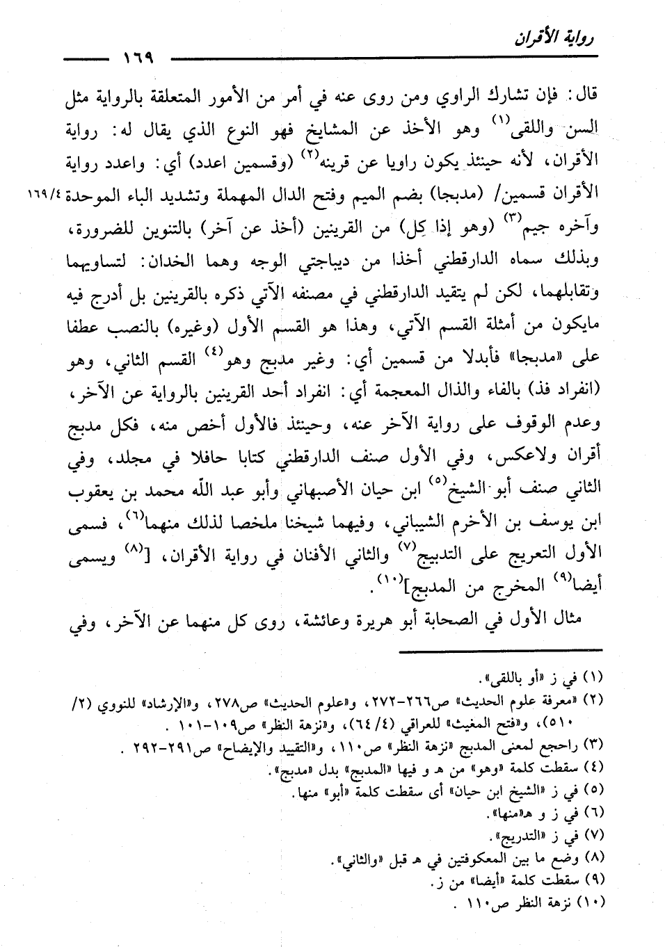 قَالَ: فَإِنْ تَشَارَكَ الرَّاوِي وَمَنْ رَوَى عَنْهُ فِي أَمْرٍ مِنَ الْأُمُورِ الْمُتَعَلِّقَةِ بِالرِّوَايَةِ ; مِثْلِ السِّنِّ وَاللُّقِيِّ، وَهُوَ الْأَخْذُ عَنِ الْمَشَايِخِ، فَهُوَ النَّوْعُ الَّذِي يُقَالُ لَهُ: رِوَايَةُ الْأَقْرَانِ ; لِأَنَّهُ حِينَئِذٍ يَكُونُ رَاوِيًا عَنْ قَرِينِهِ. (وَقِسْمَيْنِ اعْدُدِ) ; أَيْ: وَاعْدُدْ رِوَايَةَ الْأَقْرَانِ قِسْمَيْنِ: (مُدَبَّجًا) بِضَمِّ الْمِيمِ وَفَتْحِ الدَّالِ الْمُهْمَلَةِ وَتَشْدِيدِ الْبَاءِ الْمُوَحَّدَةِ وَآخِرُهُ جِيمٌ، (وَهْوَ إِذَا كُلٌّ) مِنَ الْقَرِينَيْنِ (أَخَذْ عَنْ آخَرٍ) بِالتَّنْوِينِ لِلضَّرُورَةِ، وَبِذَلِكَ سَمَّاهُ الدَّارَقُطْنِيُّ أَخْذًا مِنْ دِيبَاجَتَيِ الْوَجْهِ، وَهُمَا الْخَدَّانِ ; لِتَسَاوِيهِمَا وَتَقَابُلِهِمَا. وَلَكِنْ لَمْ يَتَقَيَّدِ الدَّارَقُطْنِيُّ فِي مُصَنَّفِهِ الْآتِي ذِكْرُهُ بِالْقَرِينَيْنِ، بَلْ أَدْرَجَ فِيهِ مَا يَكُونُ مِنْ أَمْثِلَةِ الْقِسْمِ الْآتِي، وَهَذَا هُوَ الْقِسْمُ الْأَوَّلُ. (وَغَيْرَهُ) بِالنَّصْبِ عَطْفًا عَلَى (مُدَبَّجًا) فَأُبْدِلَا مِنْ قِسْمَيْنِ ; أَيْ: وَغَيْرَ مُدَبَّجٍ، وَهُوَ الْقِسْمُ الثَّانِي، وَهُوَ (انْفِرَادُ فَذْ) بِالْفَاءِ وَالذَّالِ الْمُعْجَمَةِ ; أَيْ: انْفِرَادُ أَحَدِ الْقَرِينَيْنِ بِالرِّوَايَةِ عَنِ الْآخَرِ، وَعَدَمُ الْوُقُوفِ عَلَى رِوَايَةِ الْآخَرِ عَنْهُ.