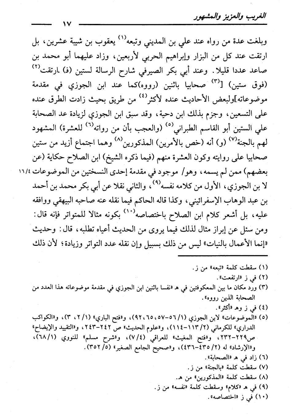 (وَالْعَجَبْ بِأَنَّ مِنْ رُوَاتِهِ لَلْعَشَرَهْ) الْمَشْهُودِ لَهُمْ بِالْجَنَّةِ. (وَ) أَنَّهُ (خُصَّ بِالْأَمْرَيْنِ) الْمَذْكُورَيْنِ ; وَهُمَا اجْتِمَاعُ أَزْيَدَ مِنْ سِتِّينَ صَحَابِيًّا عَلَى رِوَايَتِهِ، وَكَوْنُ الْعَشَرَةِ مِنْهُمْ، (فِيمَا ذَكَرَهُ الشَّيْخُ) ابْنُ الصَّلَاحِ حِكَايَةً (عَنْ بَعْضِهِمُ) مِمَّنْ لَمْ يَسْمَعْ، وَهُوَ مَوْجُودٌ فِي مُقَدِّمَةِ إِحْدَى النُّسْخَتَيْنِ مِنَ الْمَوْضُوعَاتِ لِابْنِ الْجَوْزِيِّ، الْأَوَّلُ مِنْ كَلَامِهِ نَفْسِهِ، وَالثَّانِي نَقْلًا عَنْ أَبِي بَكْرٍ مُحَمَّدِ بْنِ أَحْمَدَ بْنِ عَبْدِ الْوَهَّابِ الْإِسْفَرَائِينِيِّ.