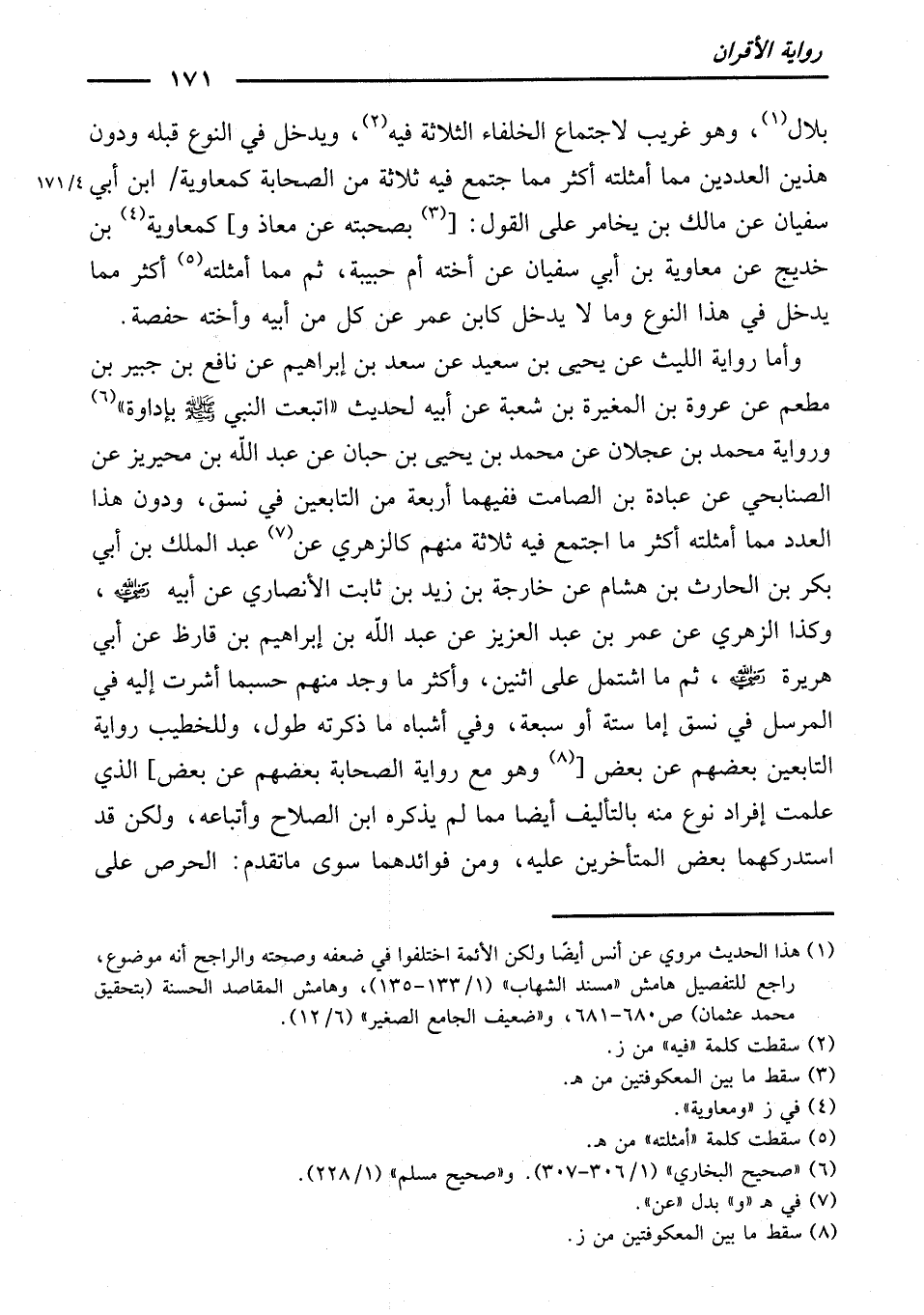 وَأَمَّا رِوَايَةُ اللَّيْثِ عَنْ يَحْيَى بْنِ سَعِيدٍ، عَنْ سَعْدِ بْنِ إِبْرَاهِيمَ، عَنْ نَافِعِ بْنِ جُبَيْرِ بْنِ مُطْعِمٍ، عَنْ عُرْوَةَ بْنِ الْمُغِيرَةِ بْنِ شُعْبَةَ، عَنْ أَبِيهِ لِحَدِيثِ: ( «اتَّبَعْتُ النَّبِيَّ - صَلَّى اللَّهُ عَلَيْهِ وَسَلَّمَ - بِإِدَاوَةٍ» ) . وَرِوَايَةُ مُحَمَّدِ بْنِ عَجْلَانَ عَنْ مُحَمَّدِ بْنِ يَحْيَى بْنِ حَبَّانَ، عَنْ عَبْدِ اللَّهِ بْنِ مُحَيْرِيزٍ، عَنِ الصُّنَابِحِيِّ، عَنْ عُبَادَةَ بْنِ الصَّامِتِ، فَفِيهِمَا أَرْبَعَةٌ مِنَ التَّابِعِينَ فِي نَسَقٍ. وَدُونَ هَذَا الْعَدَدِ مِمَّا أَمْثِلَتُهُ أَكْثَرُ مَا اجْتَمَعَ فِيهِ ثَلَاثَةٌ مِنْهُمْ ; كَالزُّهْرِيِّ عَنْ عَبْدِ الْمَلِكِ بْنِ أَبِي بَكْرِ بْنِ الْحَارِثِ بْنِ هِشَامٍ، عَنْ خَارِجَةَ بْنِ زَيْدِ بْنِ ثَابِتٍ الْأَنْصَارِيِّ، عَنْ أَبِيهِ رَضِيَ اللَّهُ عَنْهُ. وَكَذَا الزُّهْرِيُّ عَنْ عُمَرَ بْنِ عَبْدِ الْعَزِيزِ، عَنْ عَبْدِ اللَّهِ بْنِ إِبْرَاهِيمَ بْنِ قَارِظٍ، عَنْ أَبِي هُرَيْرَةَ رَضِيَ اللَّهُ عَنْهُ. ثُمَّ مَا اشْتَمَلَ عَلَى اثْنَيْنِ، وَأَكْثَرُ مَا وُجِدَ مِنْهُمْ حَسْبَمَا أَشَرْتُ إِلَيْهِ فِي الْمُرْسَلِ فِي نَسَقٍ ; إِمَّا سِتَّةٌ أَوْ سَبْعَةٌ. وَفِي أَشْبَاهِ مَا ذَكَرْتُهُ طُولٌ. وَلِلْخَطِيبِ رِوَايَةُ التَّابِعِينَ بَعْضِهِمْ عَنْ بَعْضٍ، وَهُوَ مَعَ رِوَايَةِ الصَّحَابَةِ بَعْضِهِمْ عَنْ بَعْضٍ، الَّذِي عَلِمْتَ إِفْرَادَ نَوْعٍ مِنْهُ بِالتَّأْلِيفِ أَيْضًا مِمَّا لَمْ يَذْكُرْهُ ابْنُ الصَّلَاحِ وَأَتْبَاعُهُ، وَلَكِنْ قَدِ اسْتَدْرَكَهُمَا بَعْضُ الْمُتَأَخِّرِينَ عَلَيْهِ. وَمِنْ فَوَائِدِهِمَا سِوَى مَا تَقَدَّمَ الْحِرْصُ عَلَى