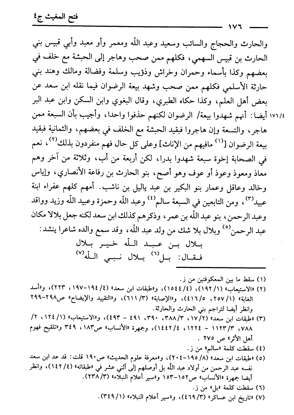وَالْحَارِثِ وَالْحَجَّاجِ وَالسَّائِبِ وَسَعِيدٍ وَعَبْدِ اللَّهِ وَمَعْمَرٍ أَوْ مَعْبَدٍ وَأَبِي قُبَيْسٍ بَنِي الْحَارِثِ بْنِ قُبَيْسٍ السَّهْمِيِّ، فَكُلُّهُمْ مِمَّنْ صَحِبَ وَهَاجَرَ إِلَى الْحَبَشَةِ مَعَ خُلْفٍ فِي بَعْضِهِمْ. وَكَذَا بِأَسْمَاءَ وَحُمْرَانَ وَخِرَاشٍ وَذُؤَيْبٍ وَسَلَمَةَ وَفَضَالَةَ وَمَالِكٍ وَهِنْدٍ بَنِي حَارِثَةَ الْأَسْلَمِيِّ، فَكُلُّهُمْ مِمَّنْ صَحِبَ وَشَهِدَ بَيْعَةَ الرِّضْوَانِ فِيمَا نَقَلَهُ ابْنُ سَعْدٍ عَنْ بَعْضِ أَهْلِ الْعِلْمِ. وَكَذَا حَكَاهُ الطَّبَرِيُّ. وَقَالَ الْبَغَوِيُّ وَابْنُ السَّكَنِ وَابْنُ عَبْدِ الْبَرِّ أَيْضًا: إِنَّهُمْ شَهِدُوا بَيْعَةَ الرِّضْوَانِ، لَكِنَّهُمْ حَذَفُوا وَاحِدًا. وَأُجِيبَ بِأَنَّ السَّبْعَةَ مِمَّنْ هَاجَرَ، وَالتِّسْعَةَ وَإِنْ هَاجَرُوا فَبِقَيْدِ الْحَبَشَةِ مَعَ الْخُلْفِ فِي بَعْضِهِمْ، وَالثَّمَانِيَةَ فَبِقَيْدِ بَيْعَةِ الرِّضْوَانِ. وَعَلَى كُلِّ حَالٍ فَهُمْ مُنْفَرِدُونَ بِذَلِكَ. نَعَمْ، فِي الصَّحَابَةِ إِخْوَةٌ سَبْعَةٌ شَهِدُوا بَدْرًا، لَكِنْ أَرْبَعَةٌ مِنْ أَبٍ، وَثَلَاثَةٌ مِنْ آخَرَ، وَهُمْ: مُعَاذٌ وَمُعَوَّذٌ وَعَوْذٌ أَوْ عَوْفٌ - وَهُوَ أَصَحُّ - بَنُو الْحَارِثِ بْنِ رِفَاعَةَ الْأَنْصَارِيِّ. وَإِيَاسٌ وَخَالِدٌ وَعَاقِلٌ وَعَامِرٌ بَنُو الْبُكَيْرِ بْنِ عَبْدِ يَالِيلَ بْنِ نَاشِبٍ، أُمُّهُمْ كُلُّهُمْ عَفْرَاءُ ابْنَةُ عُبَيْدٍ. وَمِنَ التَّابِعِينَ فِي السَّبْعَةِ: سَالِمٌ وَعَبْدُ اللَّهِ وَحَمْزَةُ وَعُبَيْدُ اللَّهِ وَزَيْدٌ وَوَاقِدٌ وَعَبْدُ الرَّحْمَنِ بَنُو عَبْدِ اللَّهِ بْنِ عُمَرَ. وَذَكَرَهُمْ كَذَلِكَ ابْنُ سَعْدٍ، لَكِنَّهُ جَعَلَ بِلَالًا مَكَانَ عَبْدِ الرَّحْمَنِ. وَبِلَالٌ بِلَا شَكٍّ مِنْ وَلَدِ عَبْدِ اللَّهِ، وَقَدْ سَمِعَ وَالِدُهُ شَاعِرًا يُنْشِدُ: