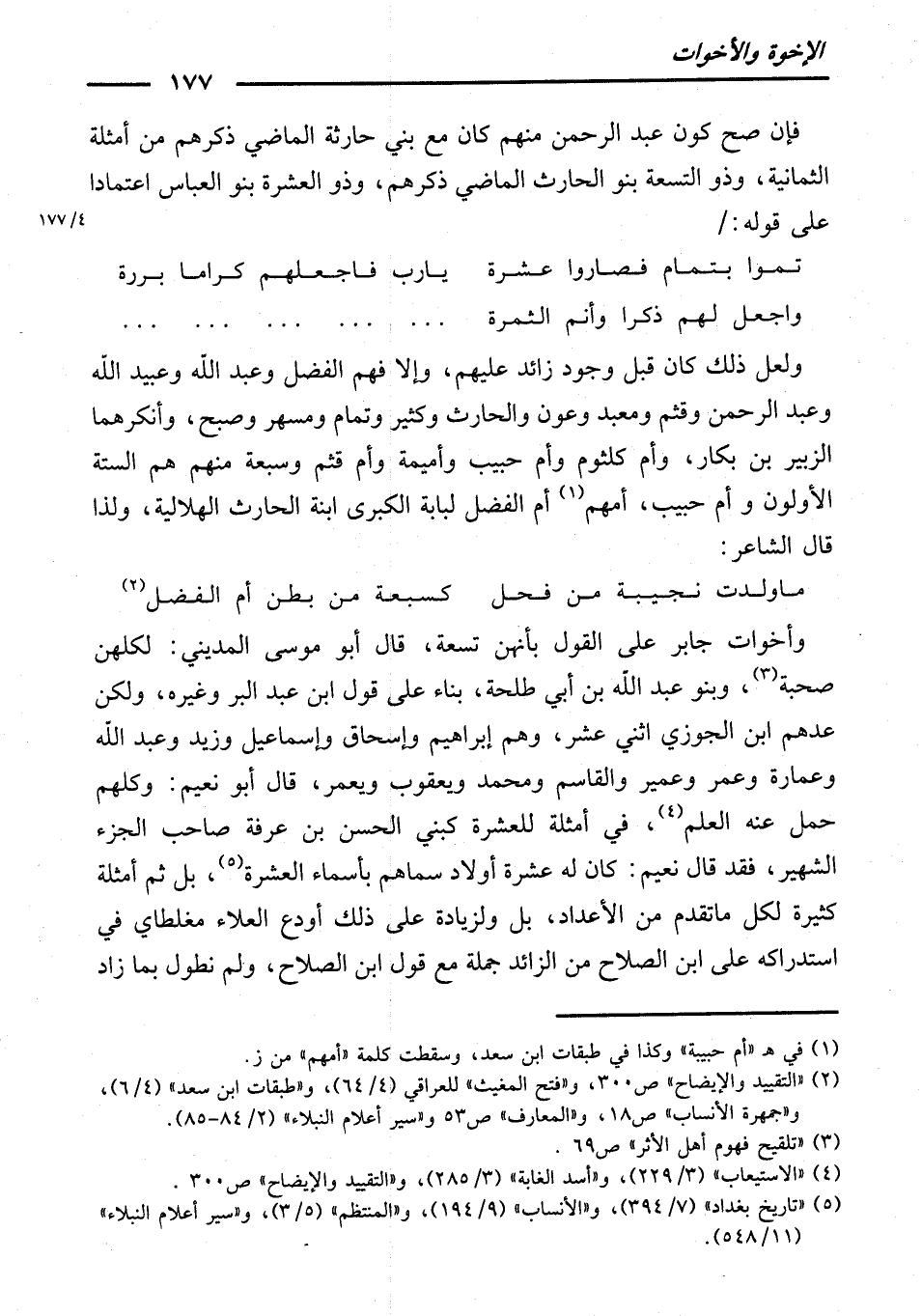 وَأَخَوَاتُ جَابِرٍ عَلَى الْقَوْلِ بِأَنَّهُنَّ تِسْعَةٌ، قَالَ أَبُو مُوسَى الْمَدِينِيُّ: لِكُلِّهِنَّ صُحْبَةٌ. وَبَنُو عَبْدِ اللَّهِ بْنِ أَبِي طَلْحَةَ، بِنَاءً عَلَى قَوْلِ ابْنِ عَبْدِ الْبَرِّ وَغَيْرِهِ. وَلَكِنْ عَدَّهُمُ ابْنُ الْجَوْزِيِّ اثْنَيْ عَشَرَ، وَهُمْ: إِبْرَاهِيمُ وَإِسْحَاقُ وَإِسْمَاعِيلُ وَزَيْدٌ وَعَبْدُ اللَّهِ وَعِمَارَةُ وَعُمَرُ وَعُمَيْرٌ وَالْقَاسِمُ وَمُحَمَّدٌ وَيَعْقُوبُ وَيَعْمَرُ. قَالَ أَبُو نُعَيْمٍ: وَكُلُّهُمْ حُمِلَ عَنْهُ الْعِلْمُ. فِي أَمْثِلَةٍ لِلْعَشَرَةِ كَبَنِي الْحَسَنِ بْنِ عَرَفَةَ صَاحِبِ الْجُزْءِ الشَّهِيرِ ; فَقَدْ قَالَ نُعَيْمٌ: كَانَ لَهُ عَشَرَةُ أَوْلَادٍ سَمَّاهُمْ بِأَسْمَاءِ الْعَشَرَةِ. بَلْ ثَمَّ أَمْثِلَةٌ كَثِيرَةٌ لِكُلِّ مَا تَقَدَّمَ مِنَ الْأَعْدَادِ. بَلْ وَلِزِيَادَةٍ عَلَى ذَلِكَ أَوْدَعَ الْعَلَاءُ مُغَلْطَايْ فِي اسْتِدْرَاكِهِ عَلَى ابْنِ الصَّلَاحِ مِنَ الزَّائِدِ جُمْلَةً مَعَ قَوْلِ ابْنِ الصَّلَاحِ، وَلَمْ نُطَوِّلْ بِمَا زَادَ
