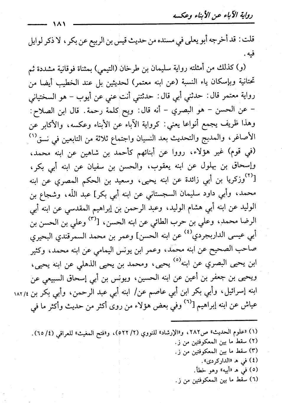 قَالَ ابْنُ الصَّلَاحِ: وَهَذَا ظَرِيفٌ يَجْمَعُ أَنْوَاعًا يَعْنِي كَرِوَايَةِ الْآبَاءِ عَنِ الْأَبْنَاءِ وَعَكْسِهِ، وَالْأَكَابِرِ عَنِ الْأَصَاغِرِ، وَالْمُدَبَّجِ وَالتَّحْدِيثِ بَعْدَ النِّسْيَانِ وَاجْتِمَاعِ ثَلَاثَةٍ مِنَ التَّابِعِينَ فِي نَسَقٍ، (فِي قَوْمِ) غَيْرِ هَؤُلَاءِ، رَوَوْا عَنْ أَبْنَائِهِمْ ; كَأَحْمَدَ بْنِ شَاهِينَ، عَنِ ابْنِهِ مُحَمَّدٍ، وَإِسْحَاقَ بْنِ بُهْلُولٍ، عَنِ ابْنِهِ يَعْقُوبُ، وَالْحَسَنِ بْنِ سُفْيَانَ، عَنِ ابْنِهِ أَبِي بَكْرٍ، وَزَكَرِيَّا بْنِ أَبِي زَائِدَةَ، عَنِ ابْنِهِ يَحْيَى، وَسَعِيدِ بْنِ الْحَكَمِ الْمِصْرِيِّ عَنِ ابْنِهِ مُحَمَّدٍ، وَأَبِي دَاوُدَ سُلَيْمَانَ السِّجِسْتَانِيِّ عَنِ ابْنِهِ أَبِي بَكْرٍ عَبْدِ اللَّهِ، وَشُجَاعِ بْنِ الْوَلِيدِ عَنِ ابْنِهِ أَبِي هِشَامٍ الْوَلِيدِ، وَعَبْدِ الرَّحْمَنِ بْنِ إِبْرَاهِيمَ الْمَقْدِسِيِّ عَنِ ابْنِهِ أَبِي الرِّضَا مُحَمَّدٍ، وَعَلِيِّ بْنِ حَرْبٍ الطَّائِيِّ عَنِ ابْنِهِ الْحَسَنِ، وَعَلِيِّ بْنِ الْحَسَنِ بْنِ أَبِي عِيسَى الدَّارْبِجِرْدِيِّ عَنِ ابْنِهِ الْحَسَنِ، وَعُمَرَ بْنِ مُحَمَّدٍ السَّمَرْقَنْدِيِّ الْبَحِيرِيِّ صَاحِبِ (الصَّحِيحِ) عَنِ ابْنِهِ مُحَمَّدٍ، وَعُمَرَ بْنِ يُونُسَ الْيَمَامِيِّ عَنِ ابْنِهِ مُحَمَّدٍ، وَكَثِيرِ بْنِ يَحْيَى الْبَصْرِيِّ عَنِ ابْنِهِ يَحْيَى، وَمُحَمَّدِ بْنِ يَحْيَى الذُّهْلِيِّ عَنِ ابْنِهِ يَحْيَى، وَيَحْيَى بْنِ جَعْفَرِ بْنِ أَعْيَنَ عَنِ ابْنِهِ الْحُسَيْنِ، وَيُونُسَ بْنِ أَبِي إِسْحَاقَ السَّبِيعِيِّ عَنِ ابْنِهِ إِسْرَائِيلَ، وَأَبِي بَكْرِ بْنِ أَبِي عَاصِمٍ عَنِ ابْنِهِ أَبِي عَبْدِ الرَّحْمَنِ، وَأَبِي بَكْرِ بْنِ عَيَّاشٍ عَنِ ابْنِهِ إِبْرَاهِيمَ، وَفِي بَعْضِ هَؤُلَاءِ مَنْ رَوَى أَكْثَرَ مِنْ حَدِيثٍ، وَأَكْثَرُ مَا فِي