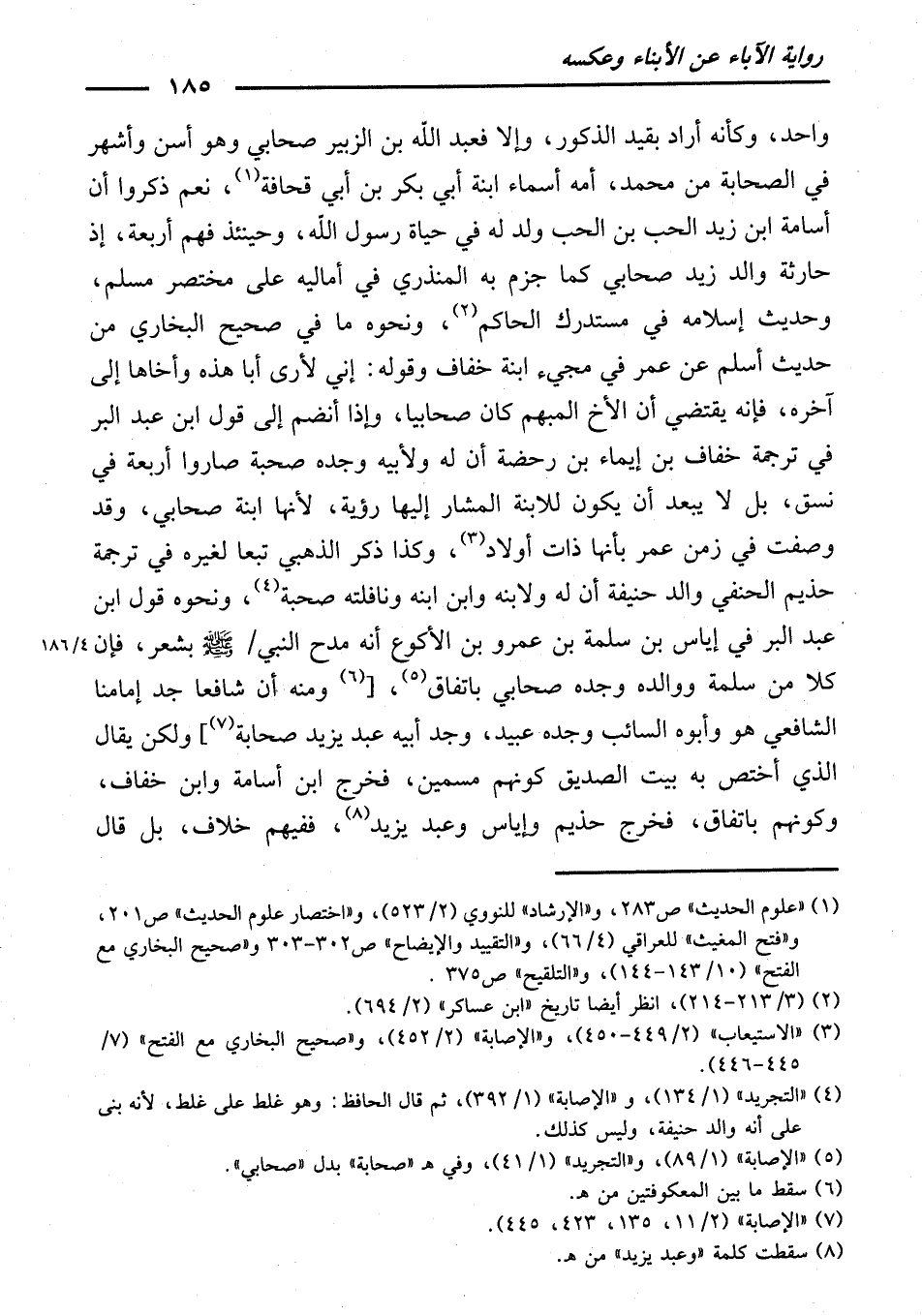 وَاحِدٍ، وَكَأَنَّهُ أَرَادَ بِقَيْدِ الذُّكُورِ، وَإِلَّا فَعَبْدُ اللَّهِ بْنُ الزُّبَيْرِ صَحَابِيٌّ، وَهُوَ أَسَنُّ وَأَشْهَرُ فِي الصَّحَابَةِ مِنْ مُحَمَّدٍ، أُمُّهُ أَسْمَاءُ ابْنَةِ أَبِي بَكْرِ بْنِ أَبِي قُحَافَةَ، نَعَمْ ذَكَرُوا أَنَّ أُسَامَةَ بْنَ زَيْدٍ الْحِبَّ ابْنَ الْحِبِّ وُلِدَ لَهُ فِي حَيَاةِ رَسُولِ اللَّهِ - صَلَّى اللَّهُ عَلَيْهِ وَسَلَّمَ -، وَحِينَئِذٍ فَهُمْ أَرْبَعَةٌ ; إِذْ حَارِثَةُ وَالِدُ زَيْدٍ صَحَابِيٌّ، كَمَا جَزَمَ بِهِ الْمُنْذِرِيُّ فِي أَمَالِيهِ عَلَى (مُخْتَصَرِ مُسْلِمٍ) ، وَحَدِيثُ إِسْلَامِهِ فِي مُسْتَدْرَكِ الْحَاكِمِ، وَنَحْوُهُ مَا فِي (صَحِيحِ الْبُخَارِيِّ) مِنْ حَدِيثِ أَسْلَمَ عَنْ عُمَرَ فِي مَجِيءِ ابْنَةِ خُفَافٍ، وَقَوْلُهُ: إِنِّي لَأَرَى أَبَا هَذِهِ وَأَخَاهَا. إِلَى آخِرِهِ ; فَإِنَّهُ يَقْتَضِي أَنَّ الْأَخَ الْمُبْهَمَ كَانَ صَحَابِيًّا، وَإِذَا انْضَمَّ إِلَى قَوْلِ ابْنِ عَبْدِ الْبَرِّ فِي تَرْجَمَةِ خُفَافِ بْنِ إِيمَاءِ بْنِ رَحَضَةَ، أَنَّ لَهُ وَلِأَبِيهِ وَجَدِّهِ صُحْبَةً، صَارُوا أَرْبَعَةً فِي نَسَقٍ، بَلْ لَا يَبْعُدُ أَنْ يَكُونَ لِلِابْنَةِ الْمُشَارِ إِلَيْهَا رُؤْيَةٌ ; لِأَنَّهَا ابْنَةُ صَحَابِيٍّ، وَقَدْ وُصِفَتْ فِي زَمَنِ عُمَرَ بِأَنَّهَا ذَاتُ أَوْلَادٍ، وَكَذَا ذَكَرَ الذَّهَبِيُّ تَبَعًا لِغَيْرِهِ فِي تَرْجَمَةِ حِذْيَمٍ الْحَنَفِيِّ وَالِدِ حَنِيفَةَ أَنَّ لَهُ وَلِابْنِهِ وَابْنِ ابْنِهِ وَنَافِلَتِهِ صُحْبَةً.